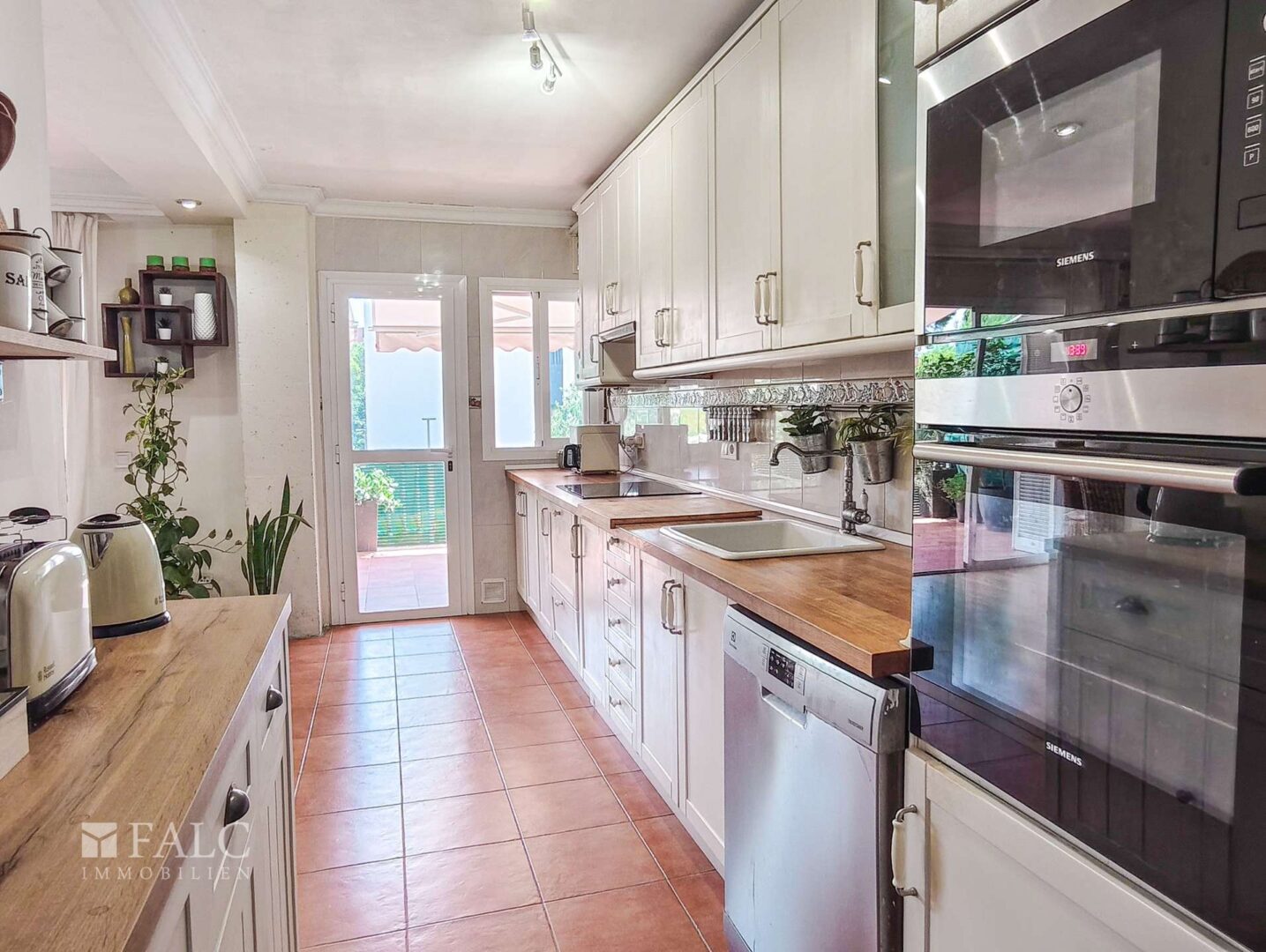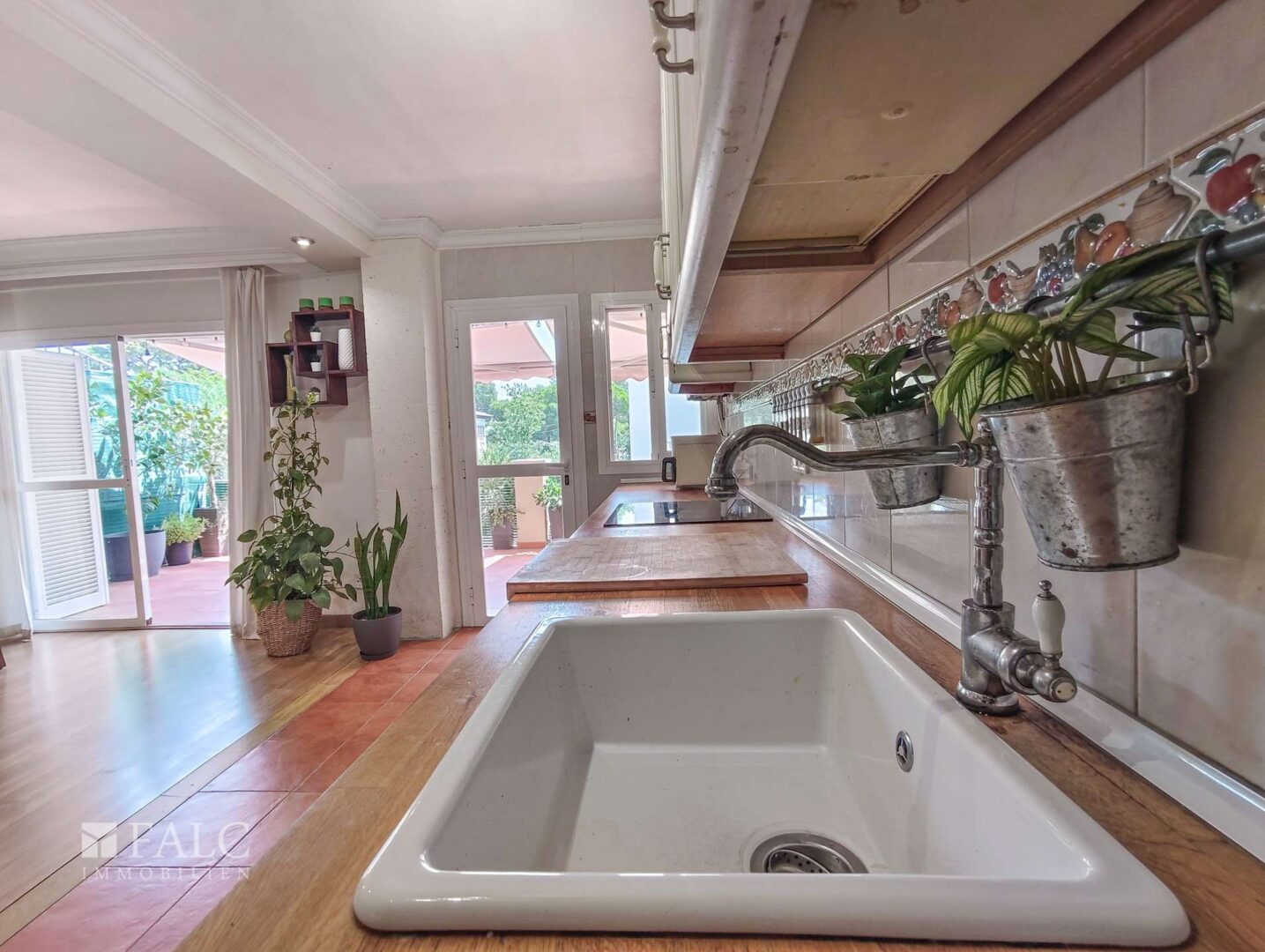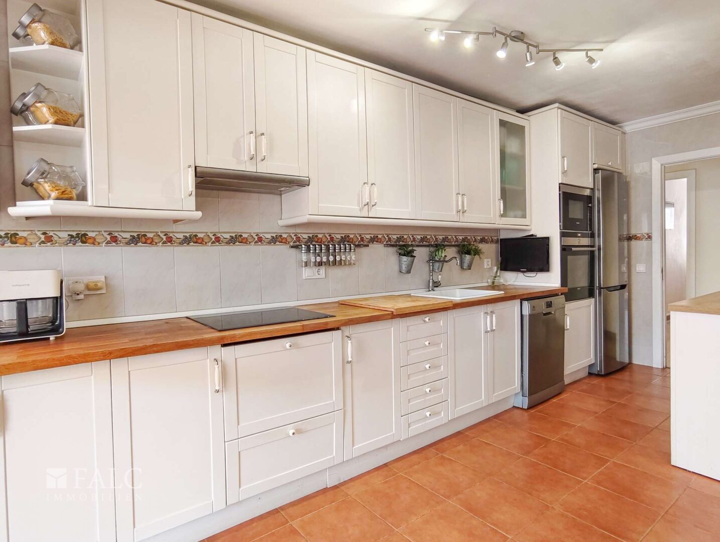 Die Wohnung verfügt über ein geräumiges Wohn-Esszimmer mit direktem Zugang zur Terrasse, ideal für Familienfeiern oder entspannte Momente im Freien. Die offene Küche ist komplett ausgestattet, bietet viel Stauraum und hat ebenfalls Zugang zur Terrasse, was für Funktionalität und Helligkeit sorgt.