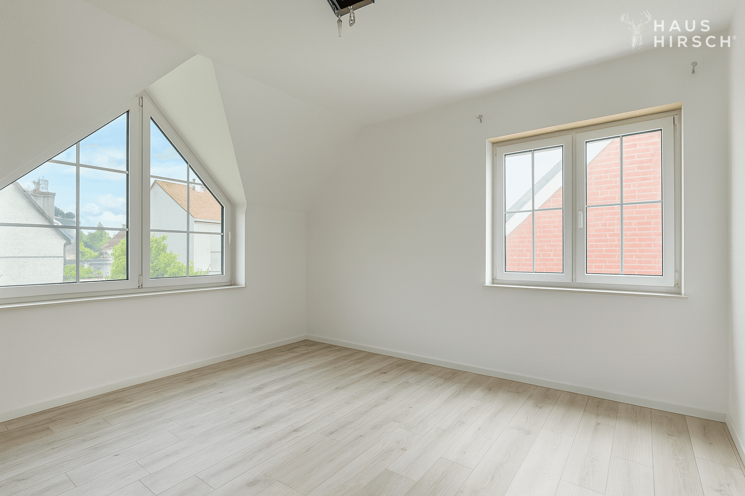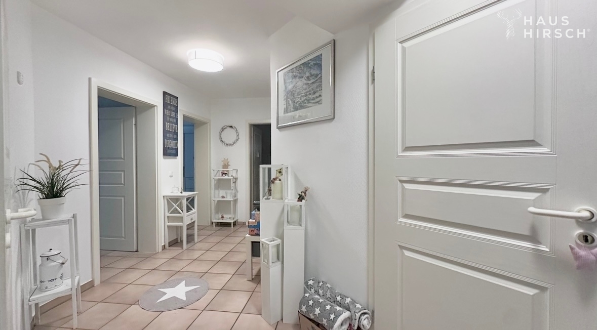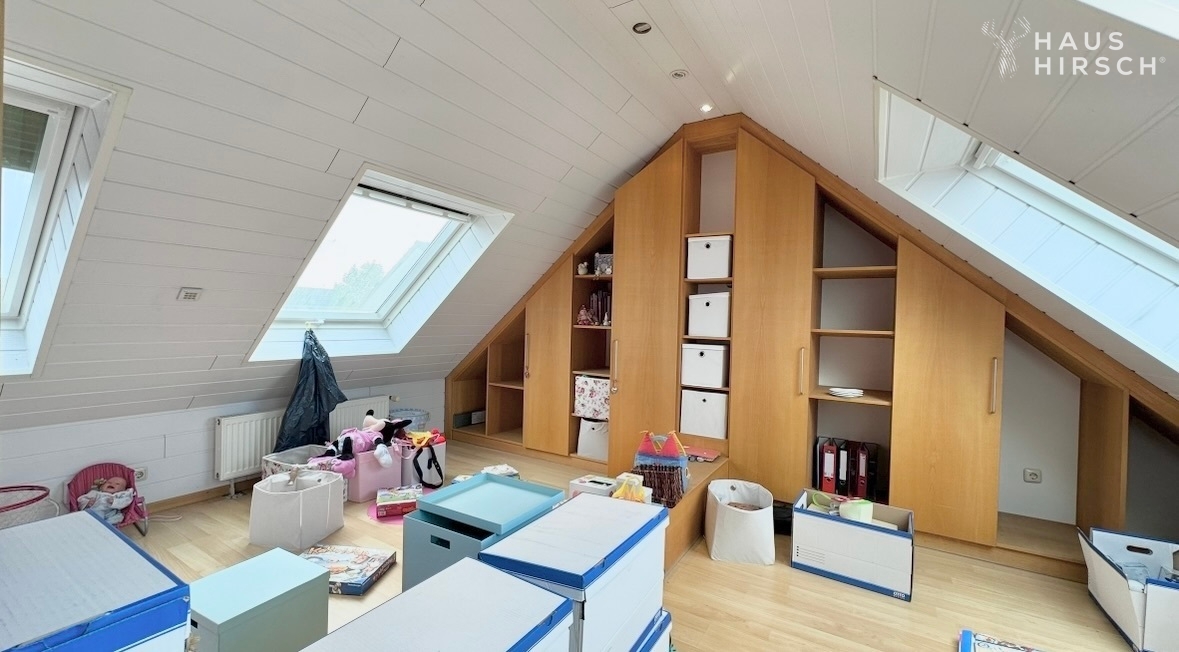 Im Obergeschoss erwarten Sie ein Elternschlafzimmer mit Klimaanlage, zwei Kinderzimmer und ein großes Tageslichtbad mit Wanne und Dusche. Das Dachgeschoss bietet ein weiteres Zimmer mit Einbauschränken und elektrischen Rolläden an den vier großen Veluxfenstern. Ein weiteres Zimmer dient als Abstellraum.