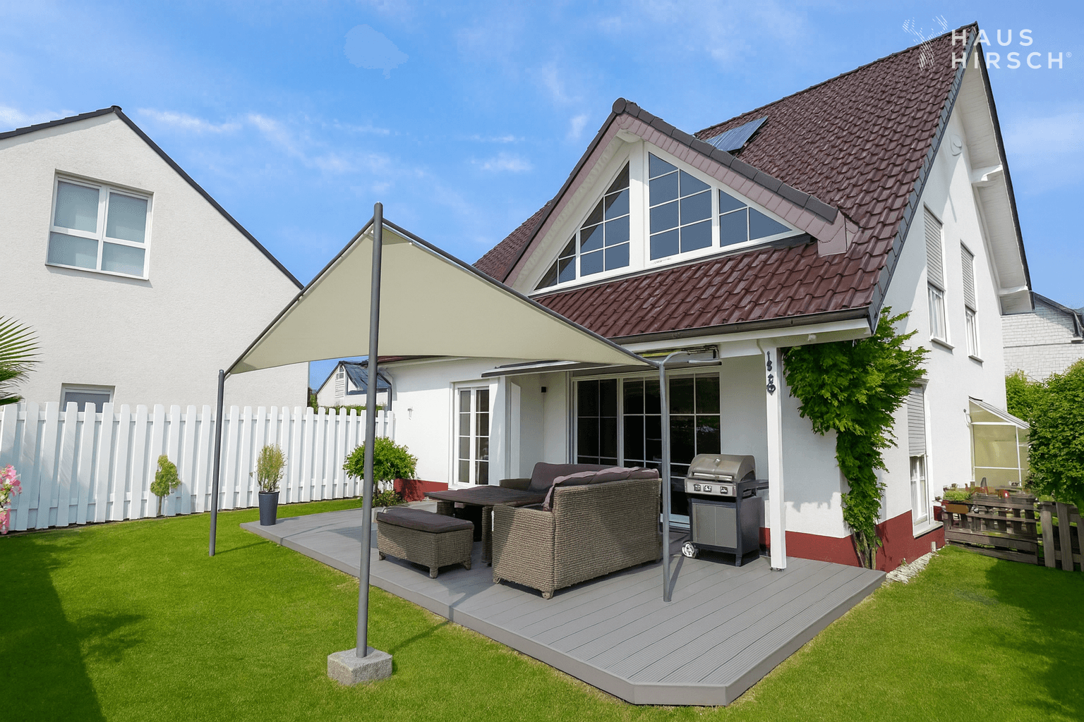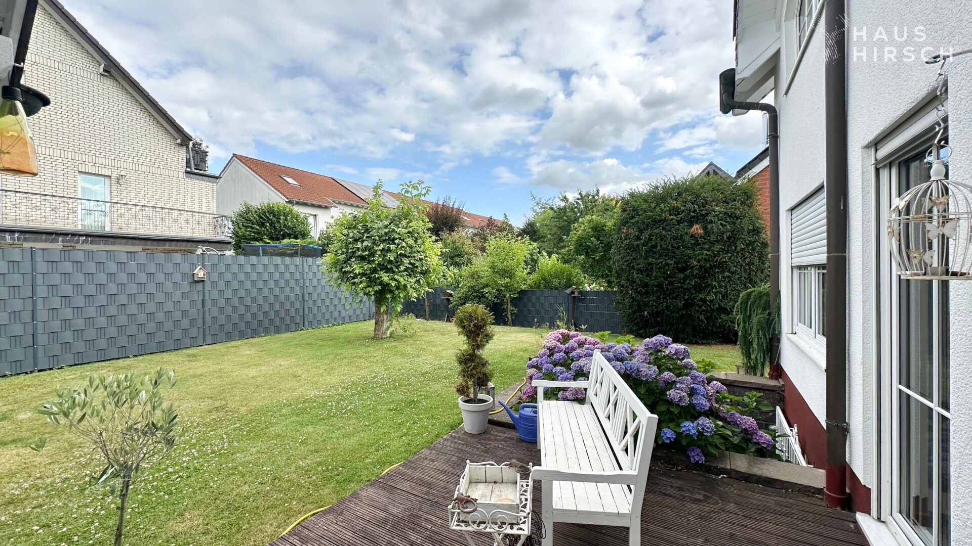 Beim Betreten des Hauses gelangen Sie zunächst in die Diele mit Garderobe, von der aus Sie Zugang zum Gäste-WC, zur Küche und zum großzügigen Wohn-/Esszimmer mit Kaminecke haben. Von hier aus führen Terrassentüren auf die beiden Terrassen, die zum Verweilen im Freien einladen. Der Garten ist halb um das Haus angelegt und verfügt über einen Pool sowie einen kleinen Schuppen für Gartengeräte.