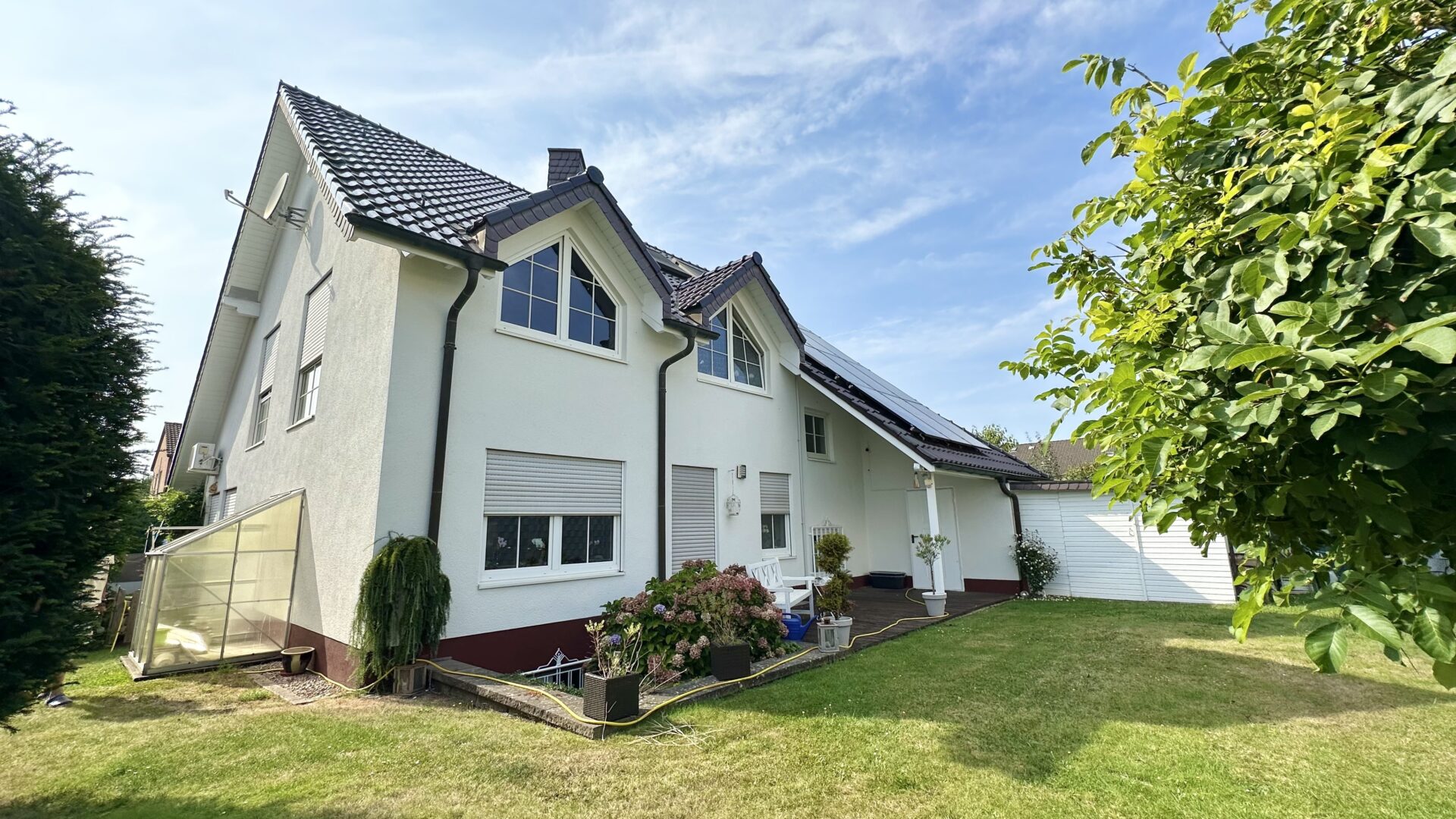 Zu Ihrem Komfort gehören außerdem eine große Garage mit Strom und Wasseranschluss, ein Gartenhäuschen und zwei Stellplätze unterm Carport. Die immer demontierbare Poolanlage sowie die Photovoltaikanlage auf dem Dach runden das Gesamtpaket dieses einzigartigen Einfamilienhauses ab.