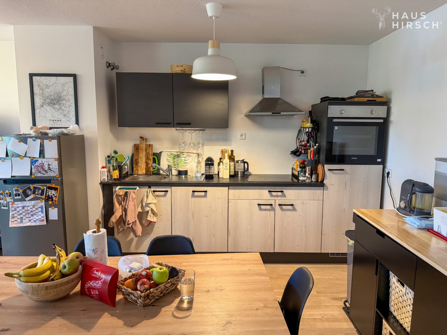 Beim Betreten der Wohnung empfängt Sie eine großzügige Diele, die Ihnen viel Platz für Garderobe und Stauraum bietet. Das Herzstück der Wohnung ist der offene Wohn- und Essbereich, der mit einer modernen Einbauküche ausgestattet ist. Die Küche verfügt über funktionale Elektrogeräte und genügend Arbeitsfläche, sodass das Kochen hier zum Vergnügen wird. Angrenzend an den Wohnbereich befindet sich die westlich ausgerichtete Loggia, die zu entspannten Stunden im Freien einlädt und genügend Platz für eine Sitzgruppe bietet.
