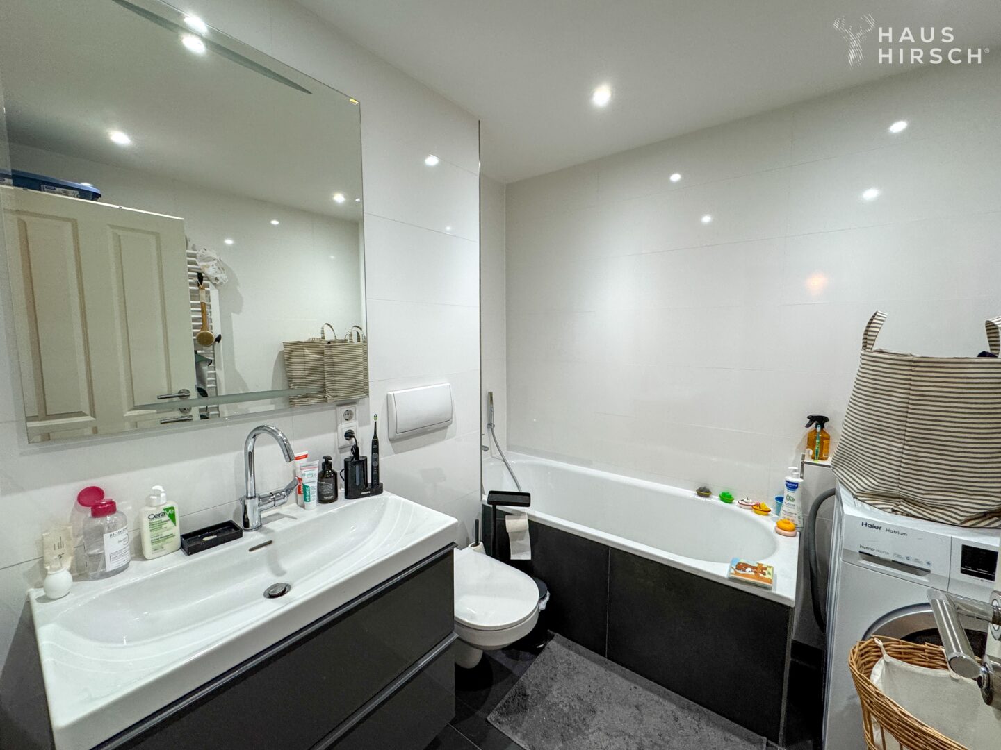 Das Hauptbadezimmer ist stilvoll ausgestattet und verfügt über eine Badewanne, WC und hochwertige Sanitärausstattung. Das zweite Badezimmer bietet ein zusätzliches WC und eine Dusche, was insbesondere für Gäste oder eine größere Familie sehr praktisch ist. Beide Bäder sind mit eleganten, schieferfarbenen Feinsteinzeugfliesen und weißen Wandfliesen gestaltet. Zusätzlich würde ein Soundsystem in den Badezimmern verbaut um voll und ganz nach einem anstrengenden Tag abschalten zu können.