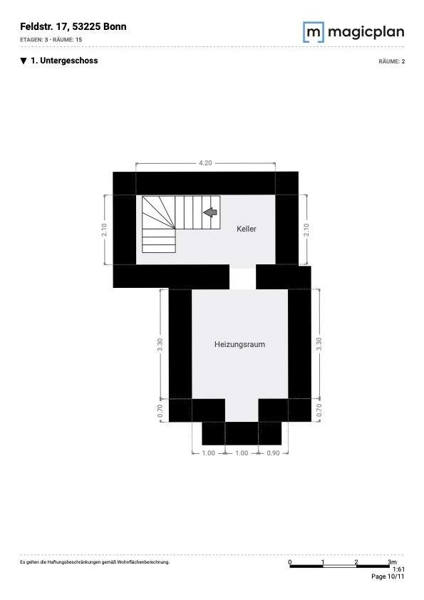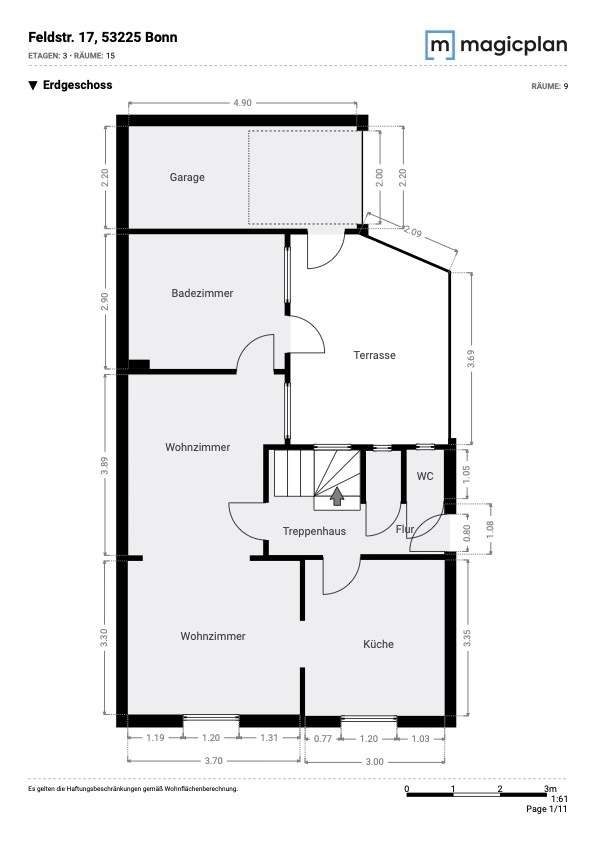 - Erdgeschoss: Diele, Küche, Esszimmer, Wohnzimmer, Badezimmer mit Wanne und Dusche, Gäste-WC, Abstellraum