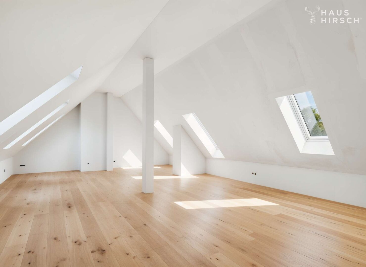 Über eine maßgefertigte Eichenholztreppe gelangen Sie in den ausgebauten Dachspitz (ca. 70,90 m² Rohfläche), dessen Raumhöhe und Gaubenlicht zum Träumen einlädt.