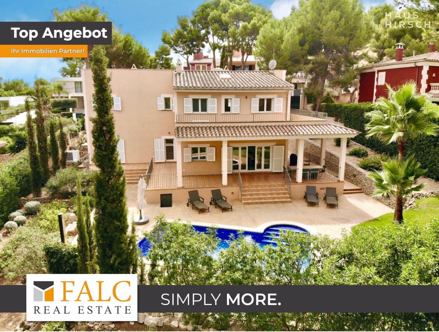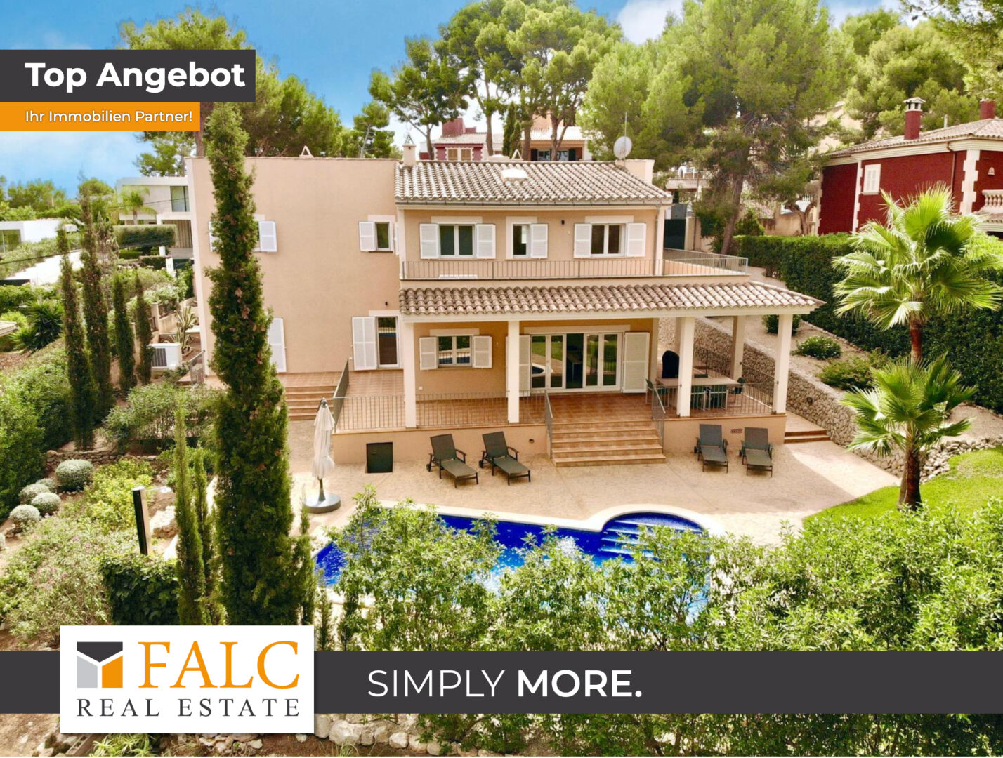 Diese Immobilie befindet sich in einer ruhigen und gefragten Wohngegend von Santa Ponça, angrenzend an die Region Costa de la Calma. Die Villa zeichnet sich durch einen lichtdurchfluteten, galerieartigen Eingangsbereich aus, der Zugang zur separaten, hochwertigen Küche mit Markengeräten von Next 125 bietet. Ebenso führt ein heller Durchgang in das großzügige Wohnzimmer mit Kamin, bodentiefen Fenstern und Schiebetüren, die direkt auf die umlaufende Terrasse, den gepflegten mediterranen Garten und den Salzwasserpool führen. Im Erdgeschoss befindet sich zudem ein weiteres Schlafzimmer mit eigenem Bad. Über eine Treppe gelangt man in das Obergeschoss, das drei weitere Schlafzimmer umfasst. Das Hauptschlafzimmer verfügt über ein eigenes Bad nebst einer Ankleide und Zugang zu einer Terrasse mit Blick auf den Garten. Die anderen beiden Schlafzimmer sind ebenfalls sehr hell, eines davon mit Zugang zu einer separaten, südlich ausgerichteten Terrasse. Die Immobilie besitzt eine ETV-Lizenz mit Genehmigung für acht Betten und ist daher ideal als Investitionsobjekt oder Familienvilla geeignet. Weitere Ausstattungsmerkmale sind: Eine großzügige Garage, Luftwärmepumpe von Stiebel Eltron, Fußbodenheizung, Alarmanlage von Daitem, ein hochwertiger Kamin, Klimaanlage, maßgefertigte Kleiderschränke, Sicherheitstüren von der Firma Bartels, volle Unterkellerung des Hauses sowie automatische Bewässerung des Gartens. Des Weiteren wurde die komplette Elektroinstallation erneuert. Die Villa wird inklusive hochwertiger Designermöbeln verkauft.