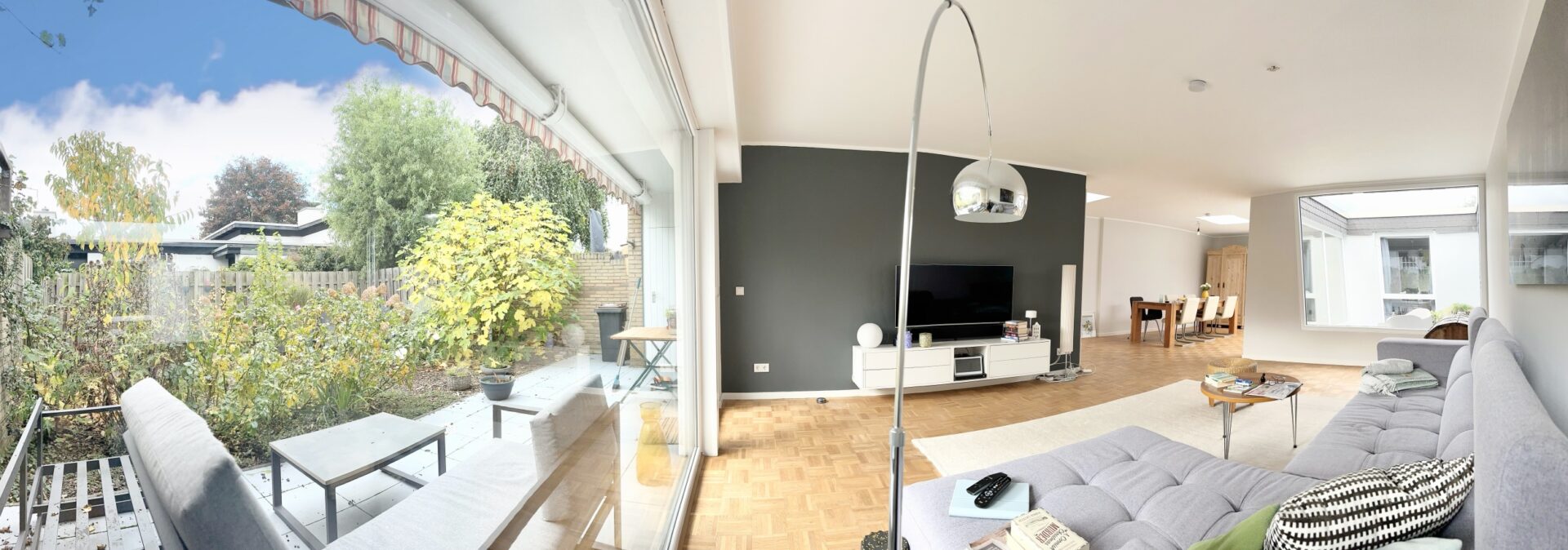 Das Herzstück bildet der großzügige Wohn- und Essbereich mit ca. 50 m², der durch große Fensterflächen sowie die direkte Verbindung zum zentralen Atrium eine außergewöhnliche Lichtwirkung und ein offenes Raumgefühl schafft. Innen- und Außenbereiche verschmelzen hier zu einer harmonischen Einheit – ein Konzept, das sowohl im Alltag als auch beim Empfang von Gästen überzeugt.