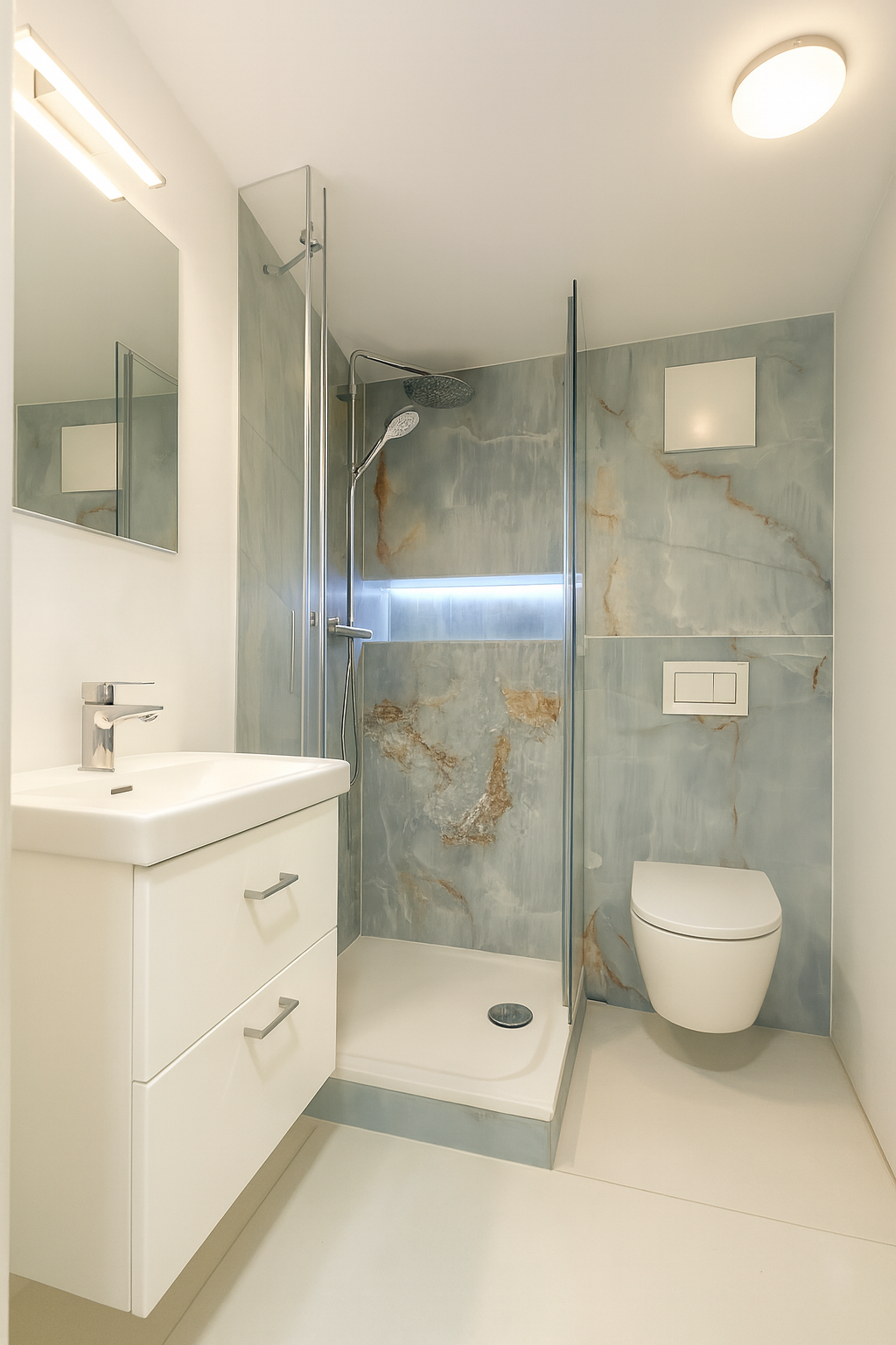Im Erdgeschoss stehen zwei gut geschnittene Schlafzimmer zur Verfügung, die durch ihre ruhige Lage und angenehme Proportionen vielseitig nutzbar sind. Das stilvolle Hauptbad überzeugt mit einer großzügigen Walk-in-Dusche, hochwertigen Armaturen und natürlichem Lichteinfall – ein Ort der Ruhe und Entspannung. Ergänzt wird das Raumangebot durch ein weiteres modernes Gäste-Duschbad.