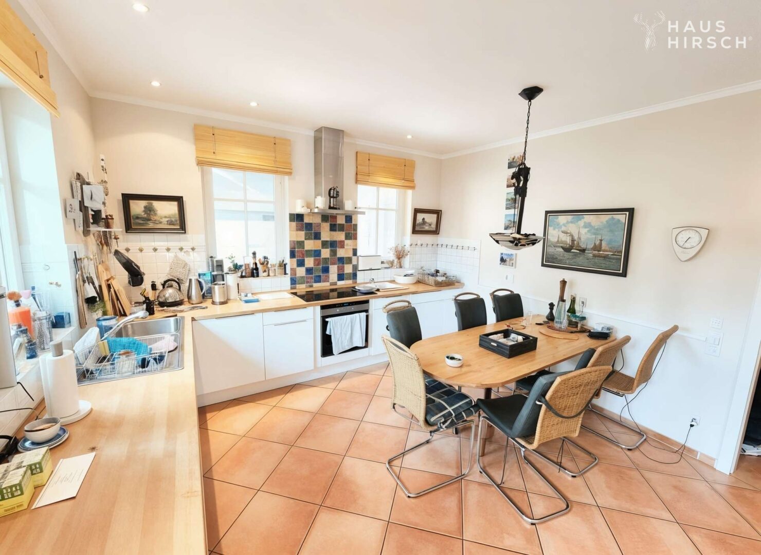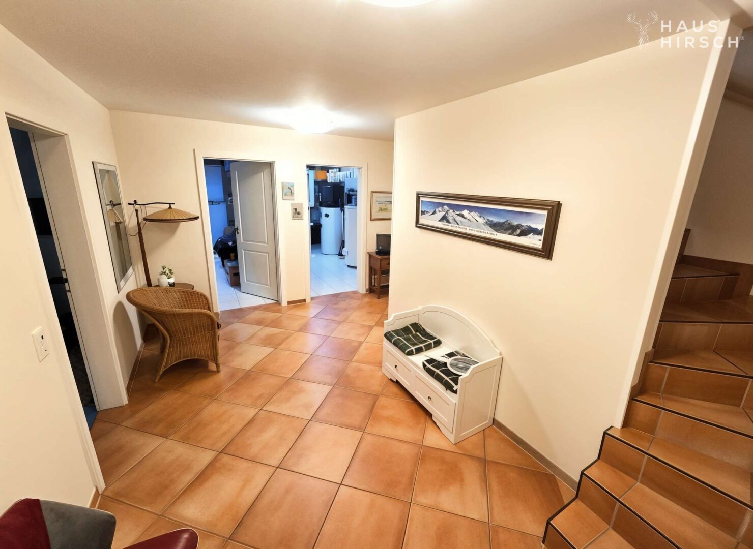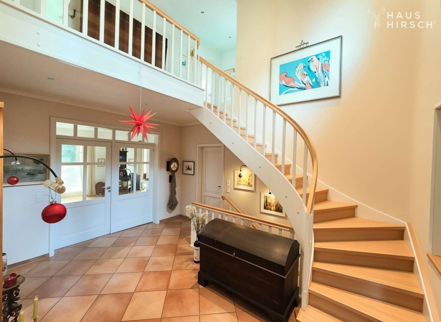 Schon das einladende Entrée mit seiner halb gewendelten Treppe zur Galerie des Obergeschosses vermittelt die Großzügigkeit dieser besonderen Immobilie. Die anschließende, moderne und zeitlos elegante Wohnküche mit Sitzgelegenheiten für bis zu sieben Personen lässt keine Wünsche offen: ein großes Induktionskochfeld, Dampfgarer, Null-Grad-Kühlschrank, Geschirrspüler und Mikrowelle – jeweils von Siemens – stehen für zeitgemäßen Wohnkomfort.
