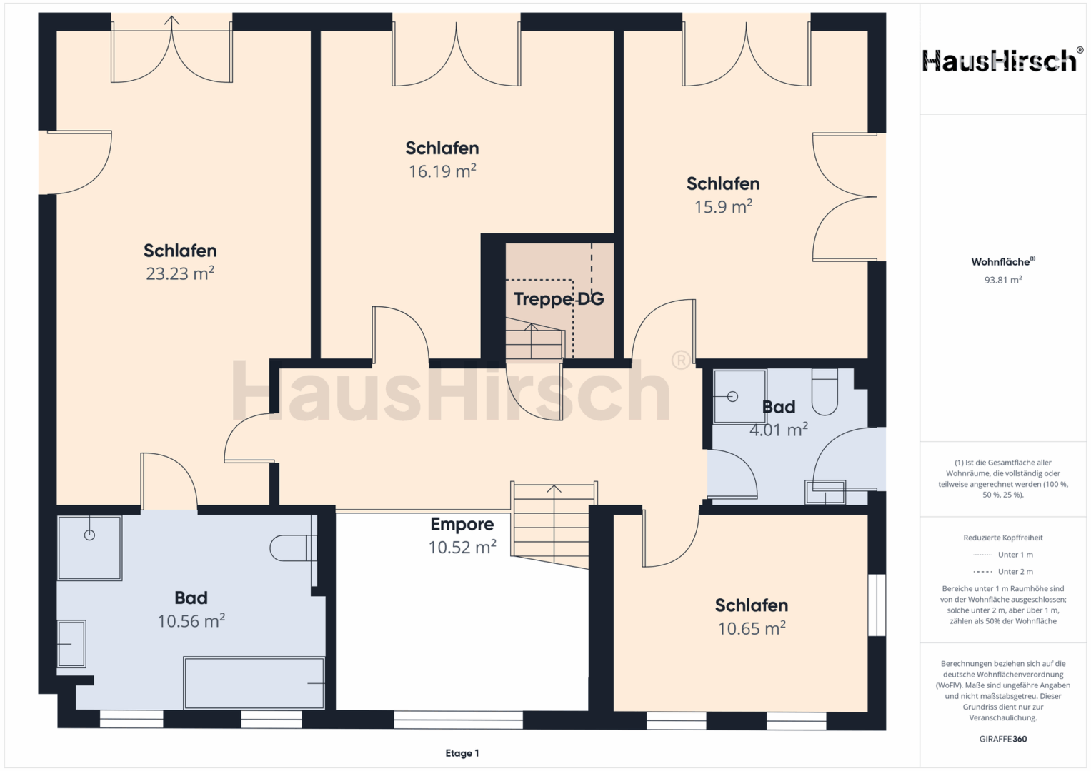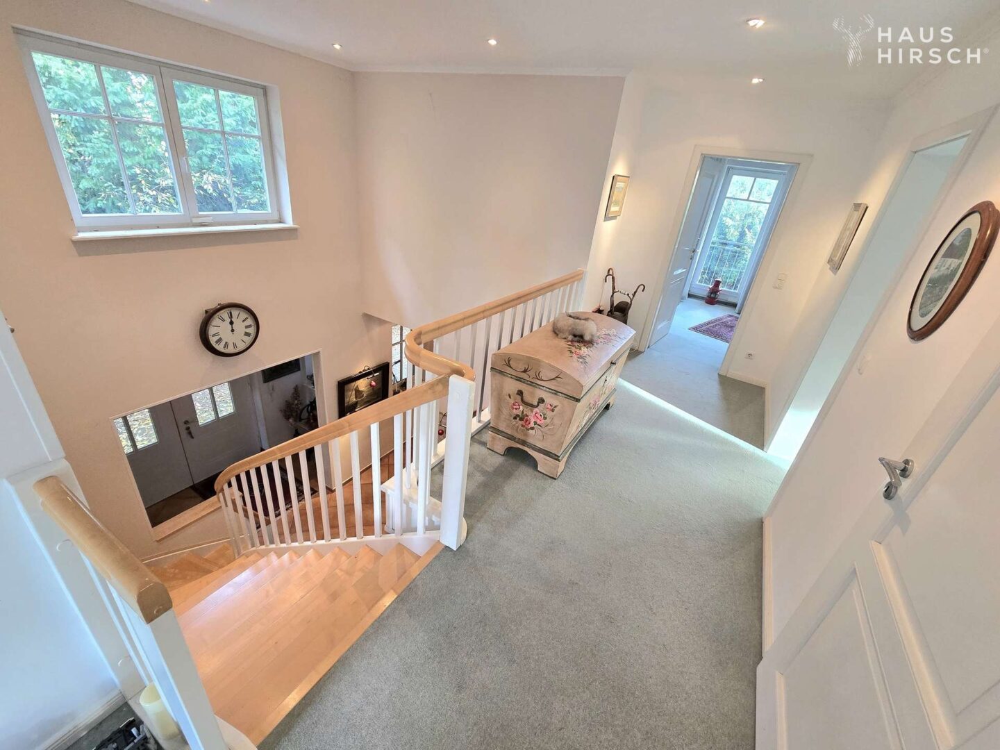 Im Obergeschoss erschließen sich vom großzügigen Galeriebereich aus vier geräumige Schlafzimmer und zwei Bäder, darunter ein Vollbad "ensuite". Über ein kleines Treppenhaus gelangt man in das ausgebaute Dachgeschoss mit Loggia, das ebenso wie das wohnlich gestaltete Souterrain – dieses mit Schlaf- und Wohnbereich, Tageslicht, Sauna und Bad – auf rund 55 m² Raum für eine separate Nutzung bietet.