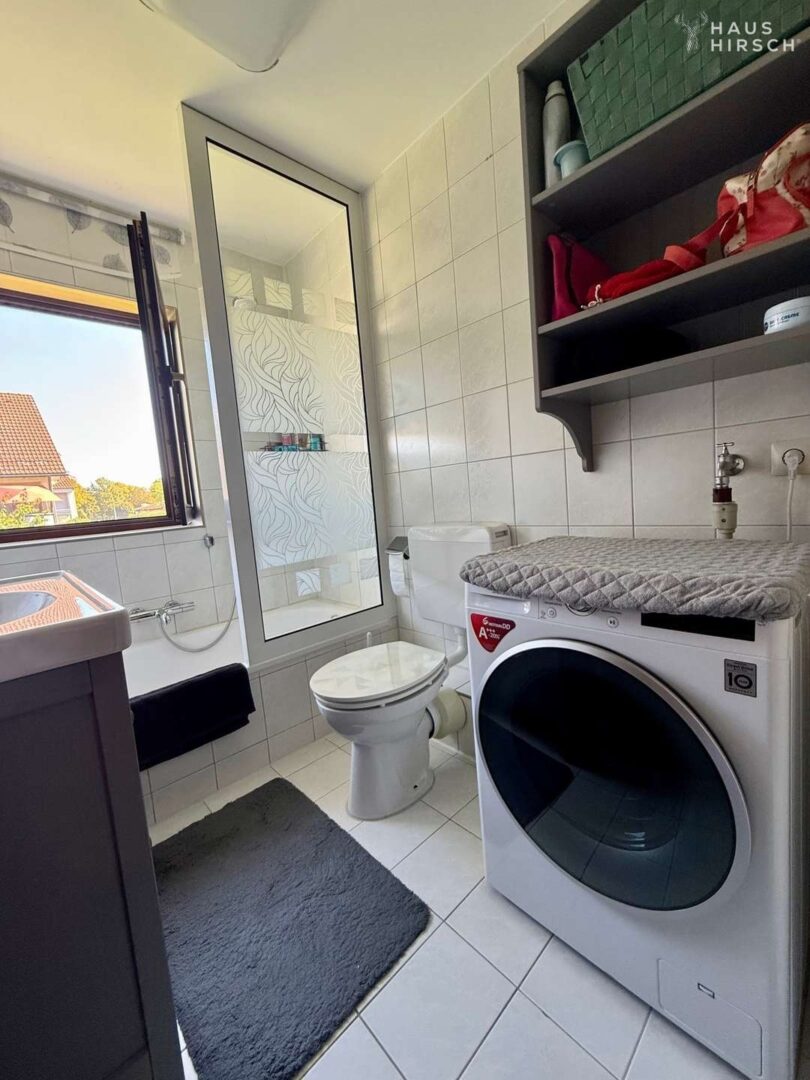 Das sehr gepflegte Tageslicht-Badezimmer ist mit Badewanne, Waschbecken und WC ausgestattet und bietet zusätzlich einen Waschmaschinenanschluss. Hier können Sie nach einem langen Tag entspannen oder sich einfach erfrischen.