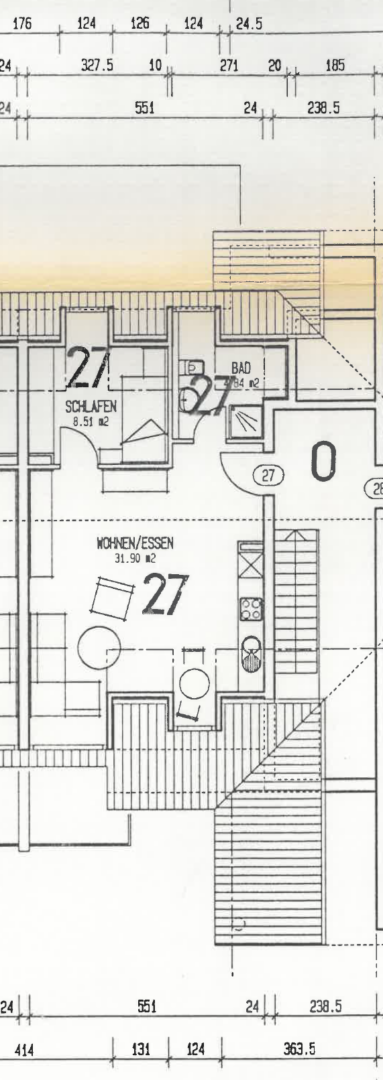 Die Aufteilung der Räume ermöglicht eine funktionale und praktische Nutzung des vorhandenen Platzes. Das Wohnzimmer und das Schlafzimmer sind geräumig und mit viel natürlichem Licht durchflutet, was eine warme und einladende Atmosphäre schafft. Die Küche ist zweckmäßig gestaltet und bietet ausreichend Platz für eine moderne Kücheneinrichtung.