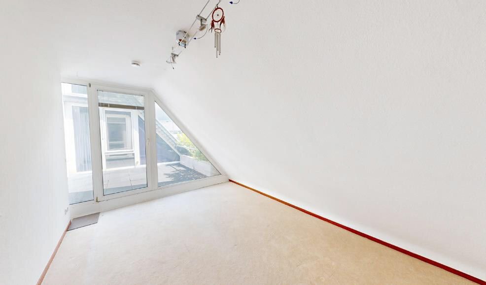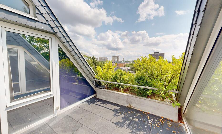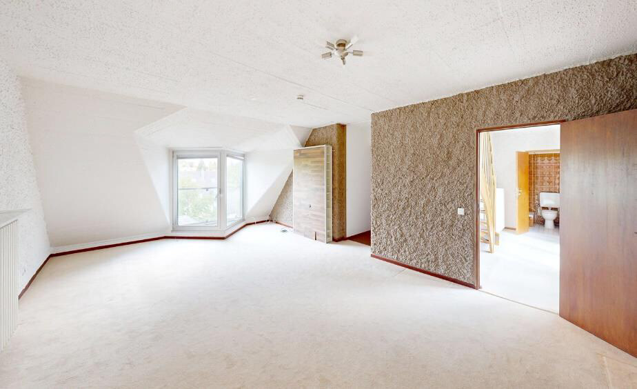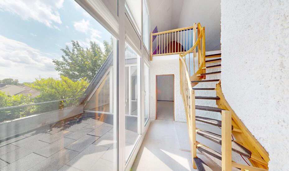 DG: zwei Einheiten zu einer großen DG-Wohnung verbunden (Fläche aufgrund geringer Schrägen etwas kleiner; zusätzlich Dachterrasse). Maisonette-Treppe in den offenen Spitzboden mit reichlich Nutz-/Staufläche.