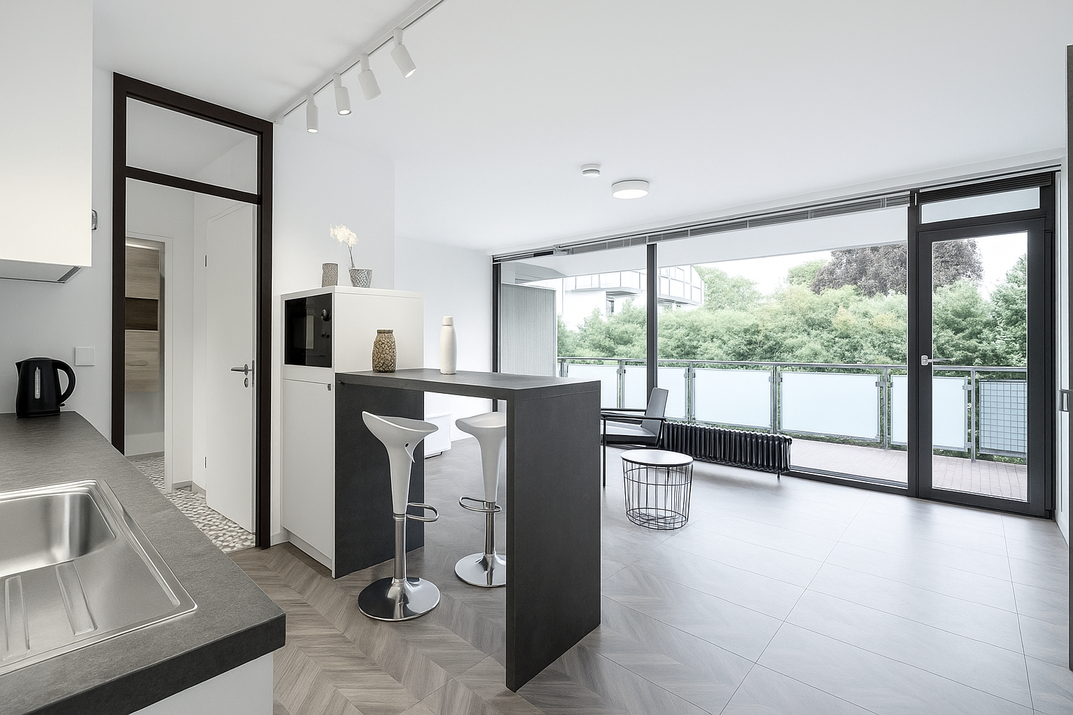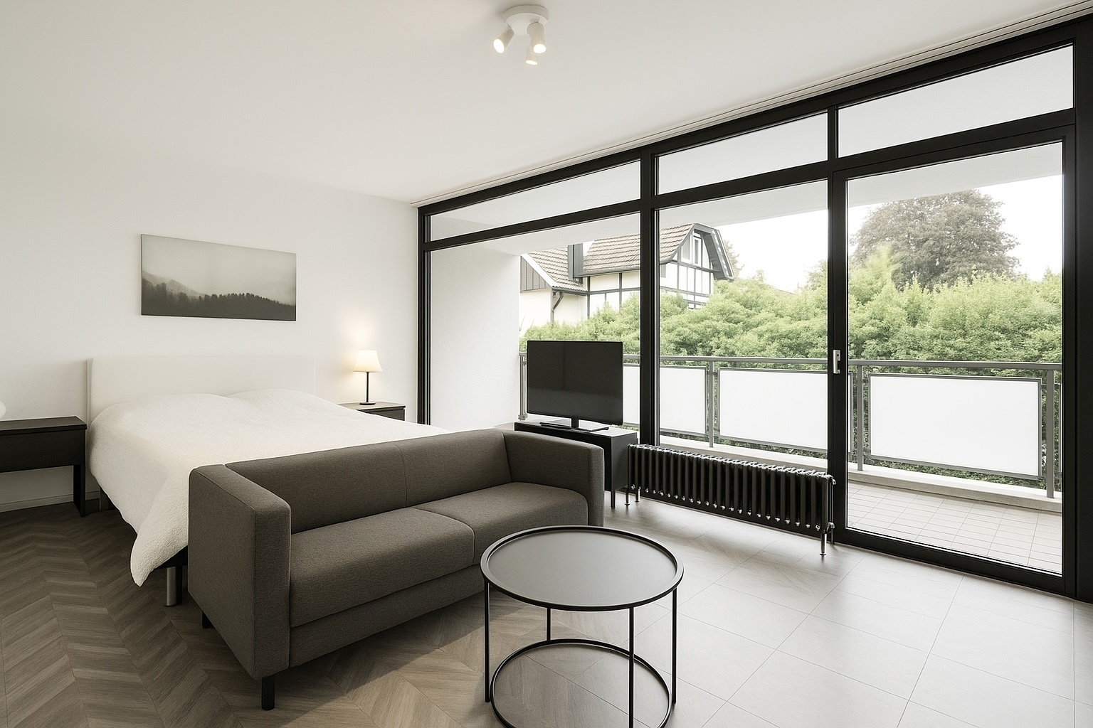 Der fast 25 qm große Wohn-/Schlafraum beeindruckt mit einer großen Fensterfront, die für optimale Lichtverhältnisse sorgt. Genießen Sie Ihre Mahlzeiten oder entspannen Sie auf der über 10 qm großen XXL-Loggia mit Südausrichtung.