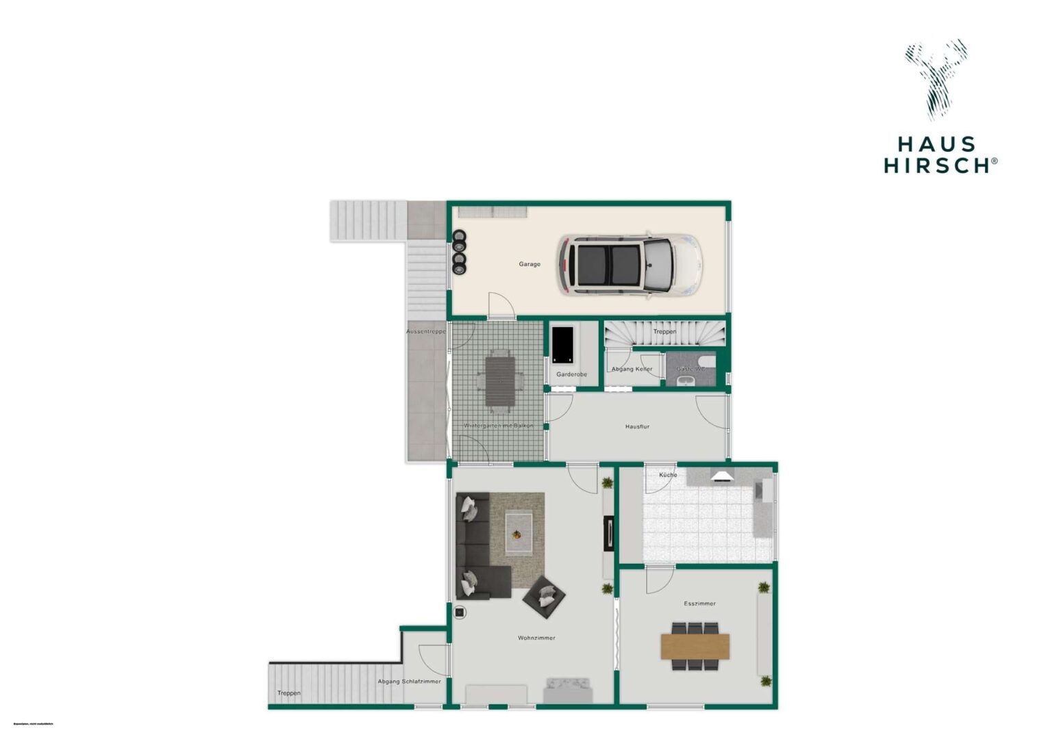 Das Obergeschoss besticht durch ein luftiges, lichtdurchflutetes Wohnzimmer mit angrenzendem Esszimmer, eine Küche, ein Gäste-WC sowie einen sonnigen Wintergarten mit Balkon und Zugang zum Garten.