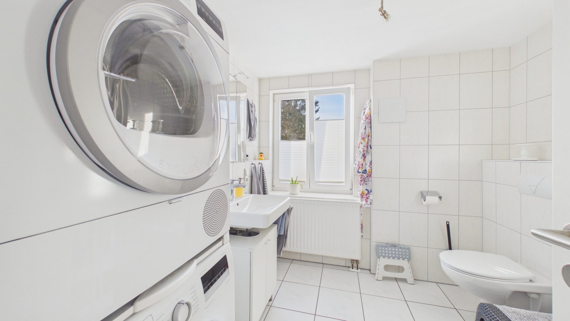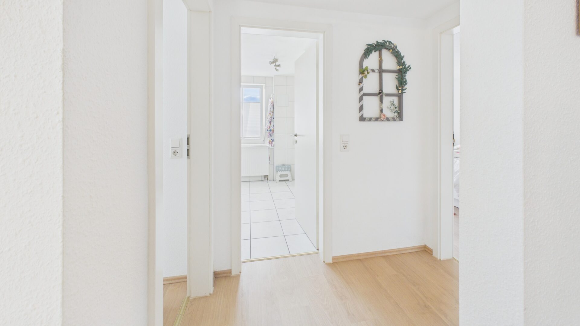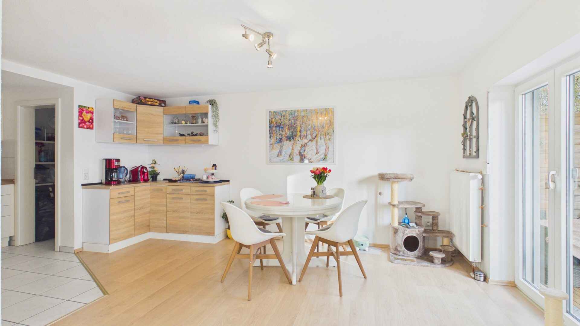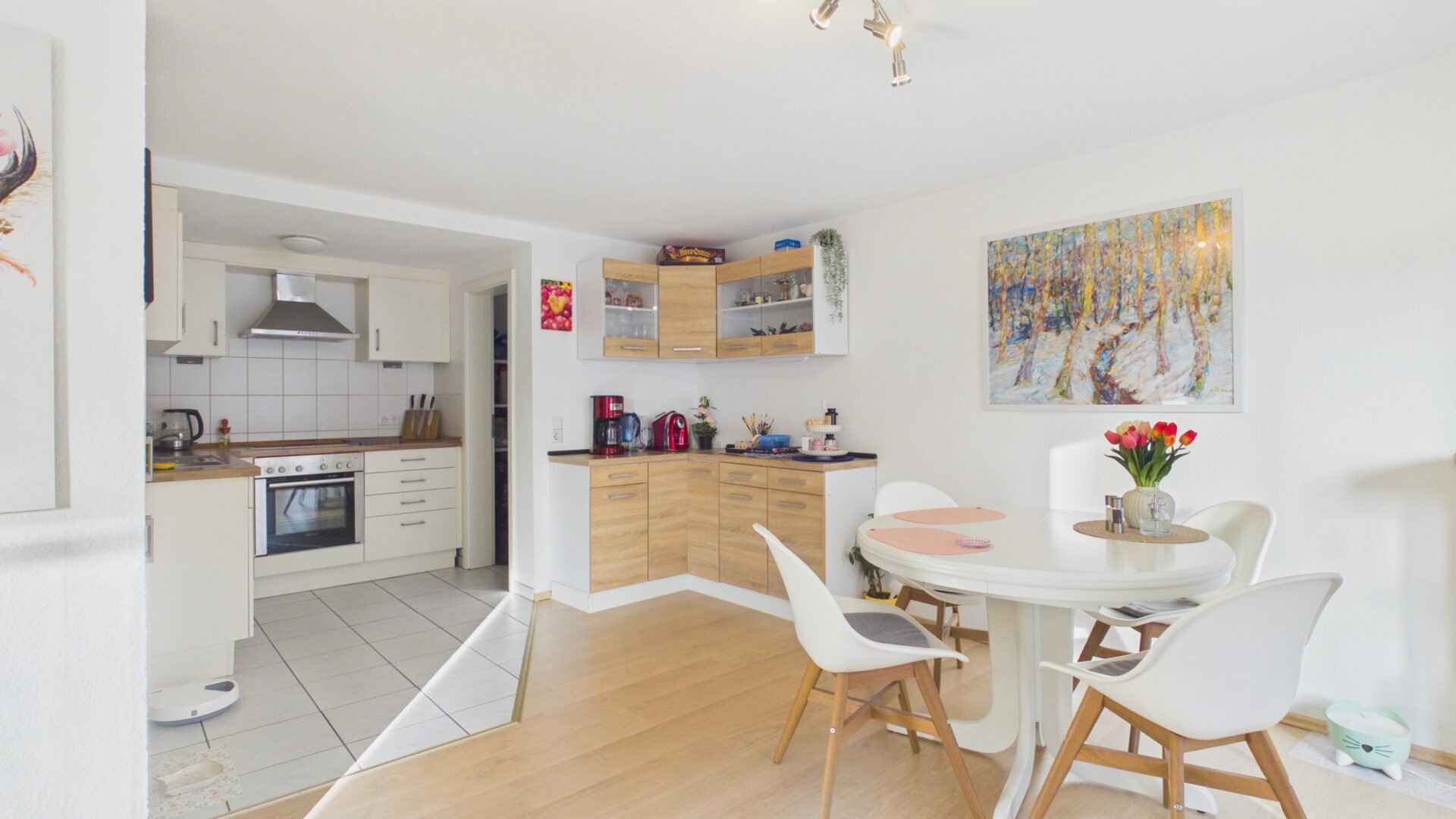 • Der Bodenbelag besteht aus einer Kombination von Fliesen und Laminat, die für eine warme und einladende Atmosphäre sorgt.