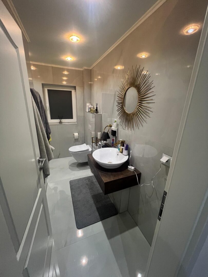 Hochwertige Materialien wie großformatige Natursteinfliesen und eine exklusive Nolte-Einbauküche mit Siemens-Geräten (Neupreis ca. 56.000 €) unterstreichen den gehobenen Anspruch dieser Immobilie.
