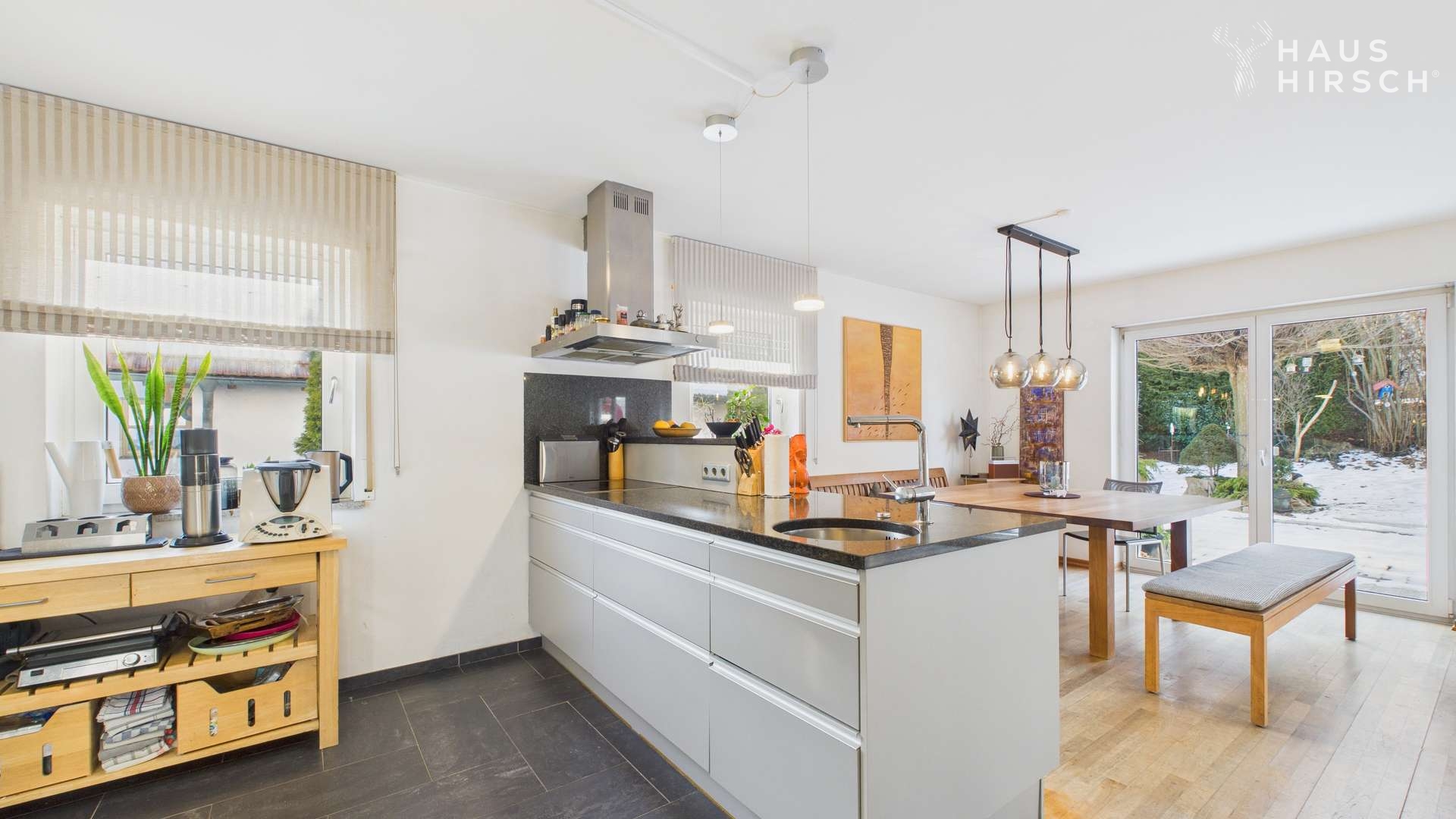 Die hochwertige Einbauküche mit Speisekammer ist durch einen offenen Übergang in den Essbereich integriert und bietet Platz für Familie, Gäste oder gemütliche Abendessen. Von hier aus gelangen Sie direkt auf die großzügige Terrasse mit Blick auf den eingewachsenen Garten und den Poolbereich.