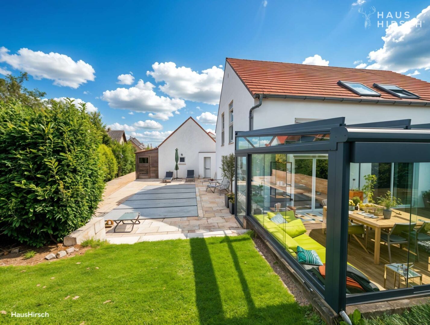 Bereits der großzügige Wohnbereich mit großflächigen Fenstern, Echtholzparkett lädt zum Ankommen ein. Der angrenzende Wintergarten mit Zugang zur Terrasse und Pool lässt sich ideal als Lounge, Essbereich oder Kreativzone nutzen – dank Beschattungssystem und großem Schiebeelement zur Gartenseite auch im Sommer angenehm kühl.
