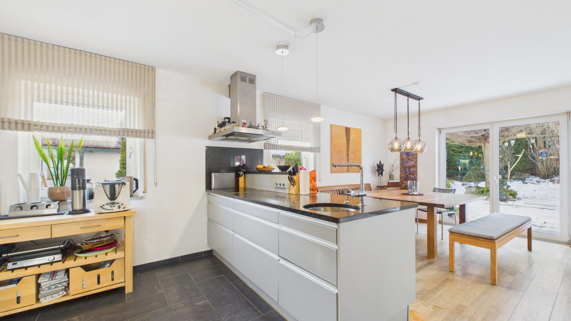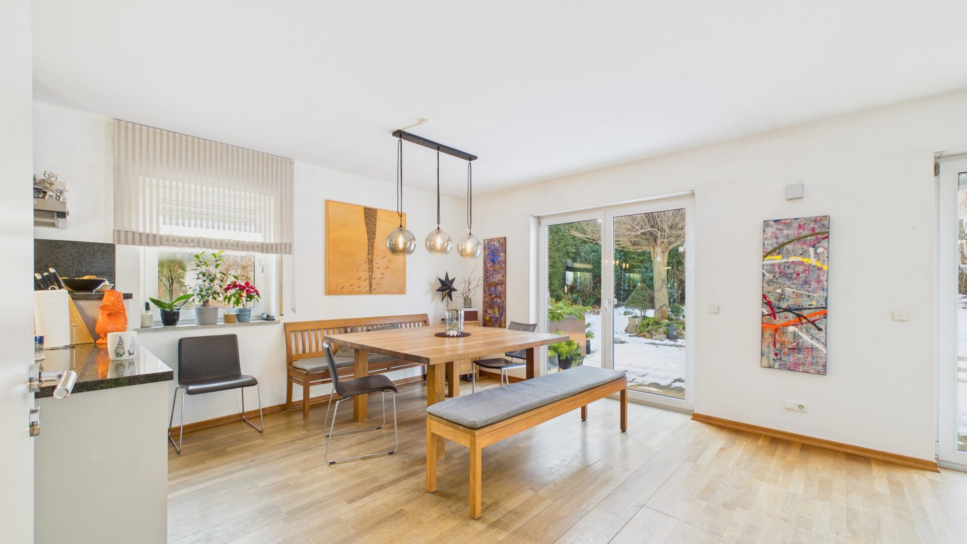 Die hochwertige Einbauküche mit Speisekammer ist durch einen offenen Übergang in den Essbereich integriert und bietet Platz für Familie, Gäste oder gemütliche Abendessen. Von hier aus gelangen Sie direkt auf die großzügige Terrasse mit Blick auf den eingewachsenen Garten und den Poolbereich.