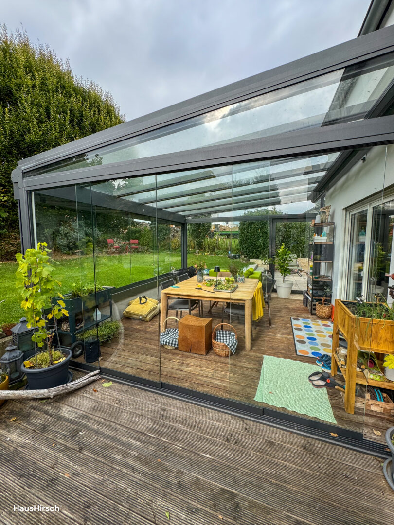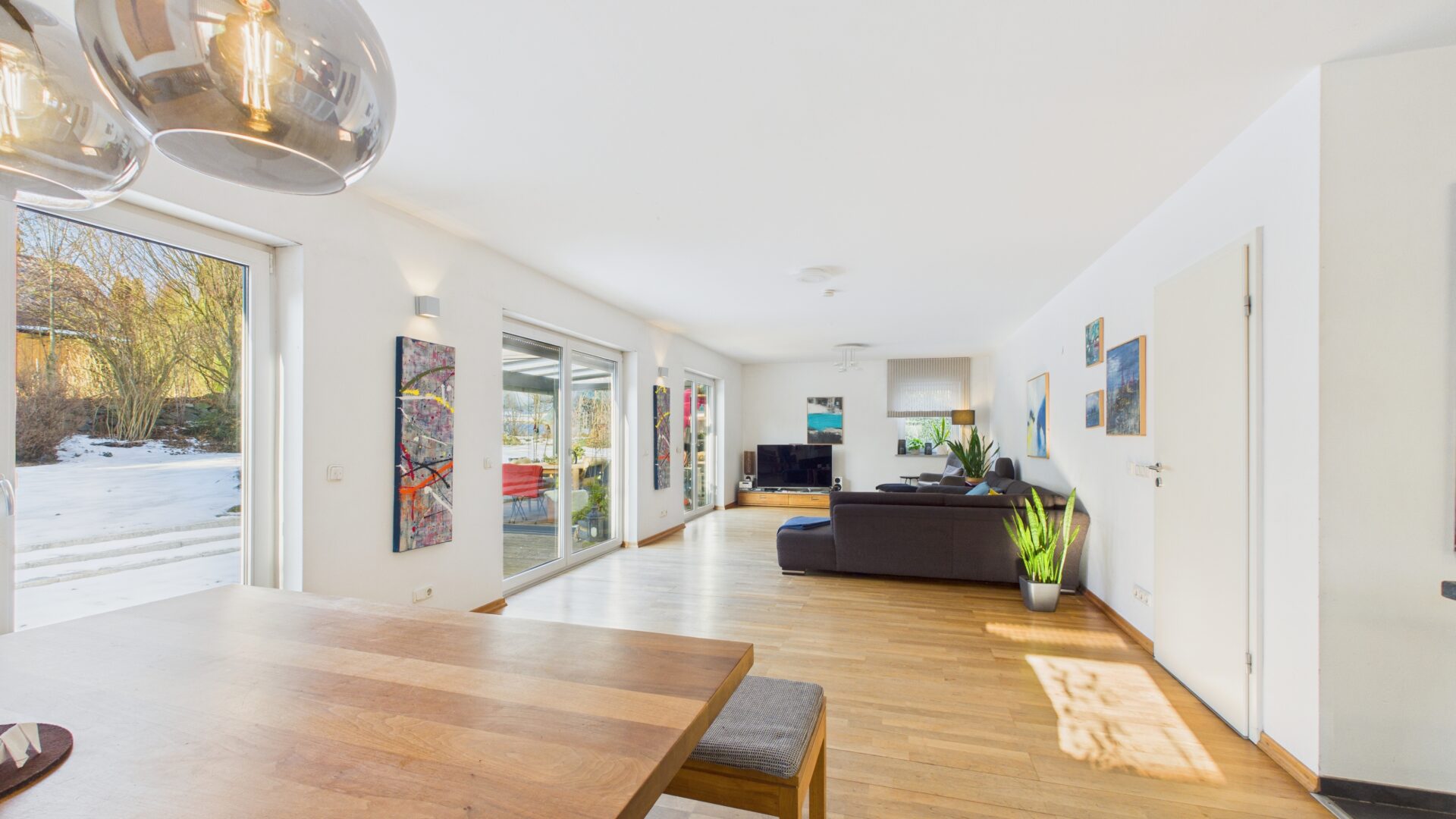 Bereits der großzügige Wohnbereich mit großflächigen Fenstern, Echtholzparkett lädt zum Ankommen ein. Der angrenzende Wintergarten mit Zugang zur Terrasse und Pool lässt sich ideal als Lounge, Essbereich oder Kreativzone nutzen – dank Beschattungssystem und großem Schiebeelement zur Gartenseite auch im Sommer angenehm kühl.