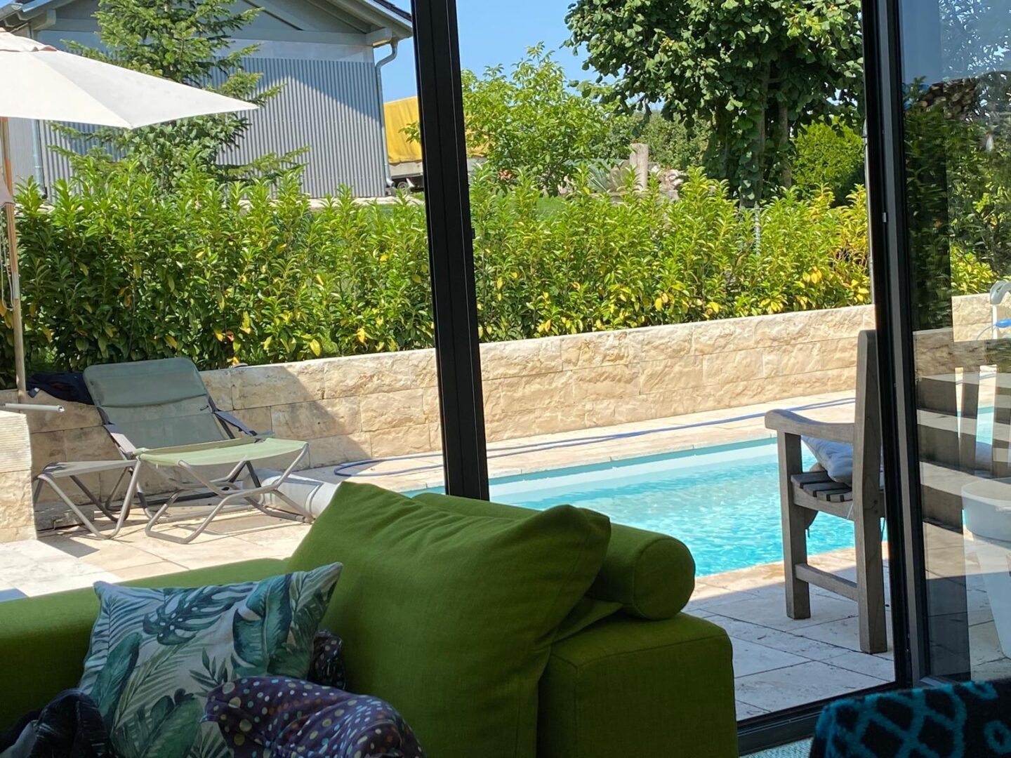 Großzügiges Wohnzimmer mit direktem Zugang zum Wintergarten und zur Südwest-Terrasse mit Pool