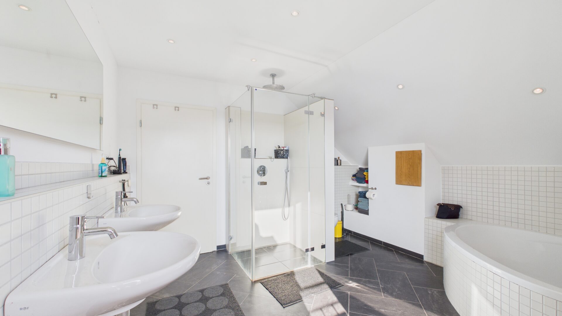 Großes Tageslichtbad mit Eckbadewanne, Regendusche & Doppelwaschbecken und Wäscheschacht