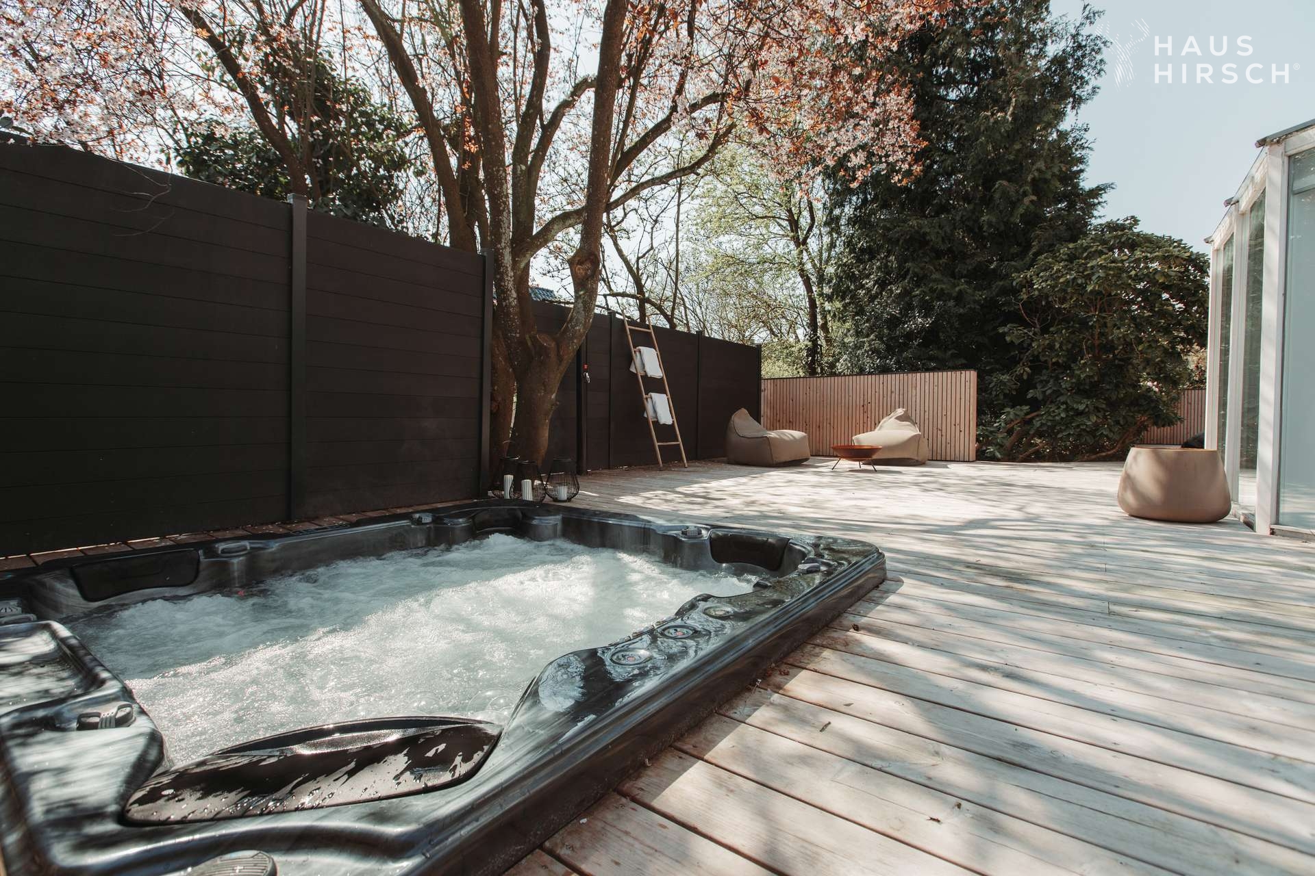 Die Terrasse ist komplett eingefriedet und verfügt über eine umlaufende Holzterrasse mit Jacuzzi und Bodenbeleuchtung. Eine Markise sorgt für Schatten an sonnigen Tagen, während die kleine Rasenfläche in Süd-Westausrichtung ideal für entspannte Stunden im Freien ist.