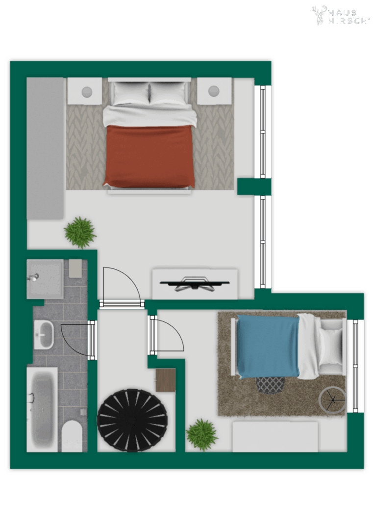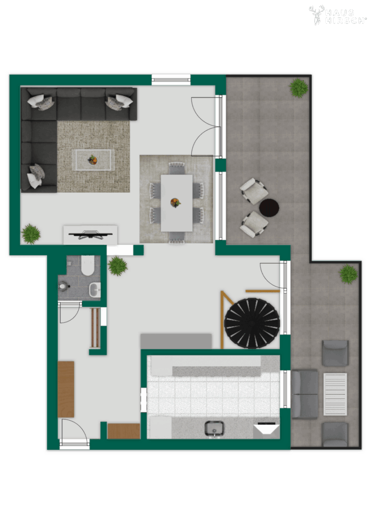 Neben dem Essbereich befindet sich eine breite, offen gestaltete Wendeltreppe, die elegant in das Untergeschoss der Maisonette führt. Gleichzeitig gelangen Sie von hier aus auf den rechten Teil der insgesamt rund 30 m² großen Dachterrasse – ein echtes Highlight der Wohnung. Die großzügige Außenfläche bietet viel Platz für unterschiedliche Sitz- und Aufenthaltsbereiche und schafft eine Erweiterung des Wohnraums unter freiem Himmel. Der Blick schweift über das dahinterliegende Waldstück und die angrenzende Parkanlage und schafft eine besonders ruhige, grüne Kulisse. Hier lassen sich ruhige Morgenstunden, entspannte Nachmittage oder lange Sommerabende in angenehmer Atmosphäre genießen.