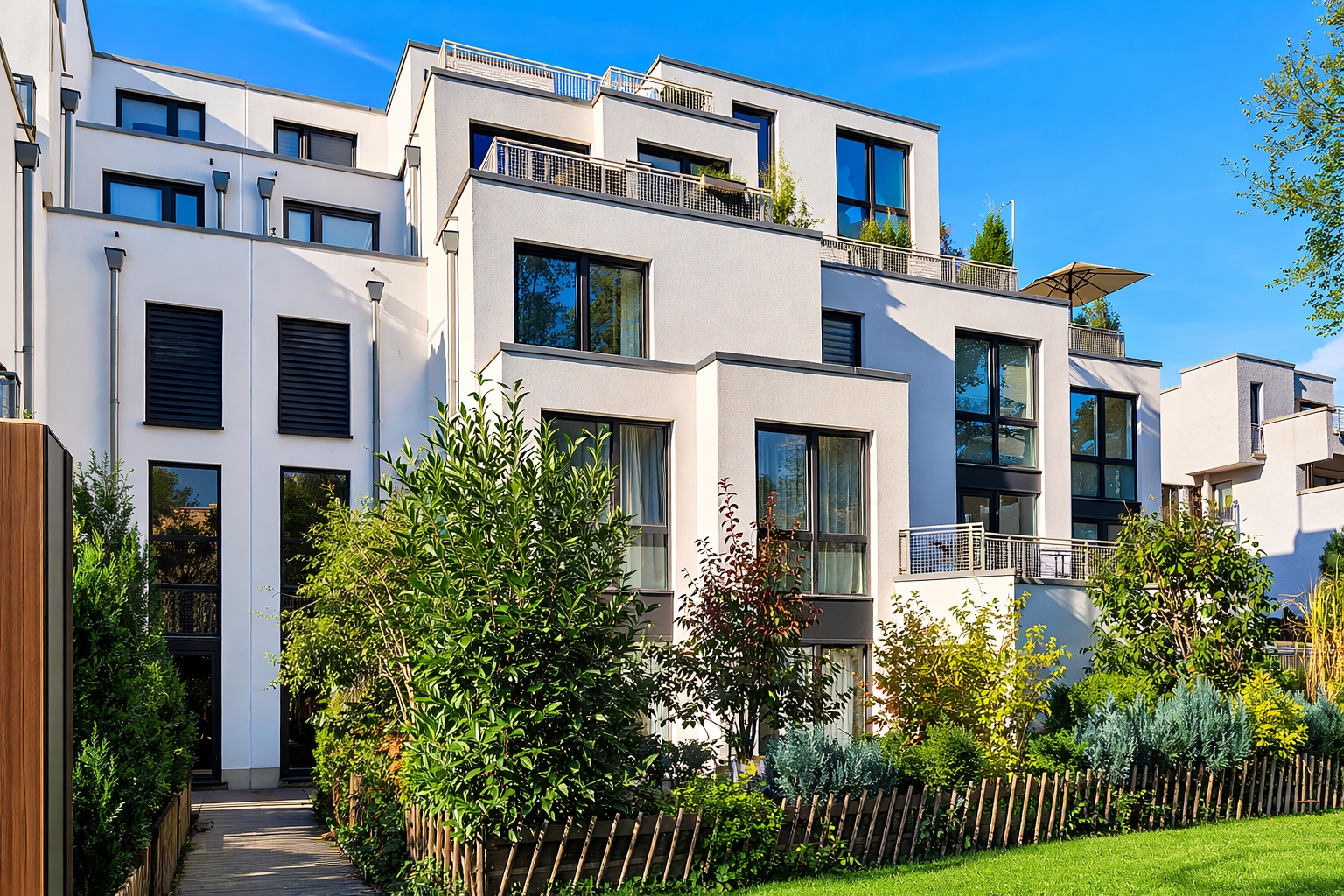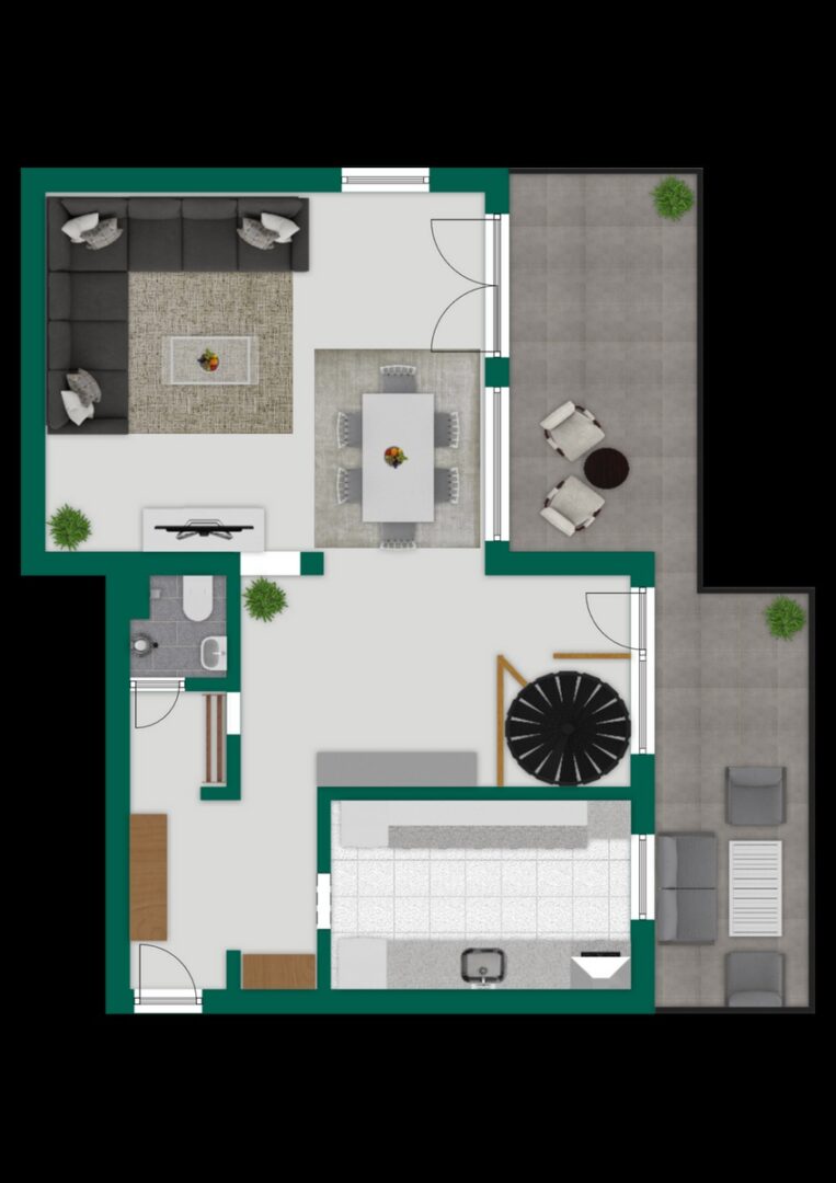 Dahinter schließt sich das großzügige Wohnzimmer mit rund 30 m² an. Große Fensterflächen sorgen für viel Tageslicht und schaffen eine helle, einladende Atmosphäre. Von hier aus gelangen Sie auf den linken Teil der Dachterrasse, die den Wohnraum nach außen erweitert und einen geschützten Platz für entspannte Momente im Freien bietet.