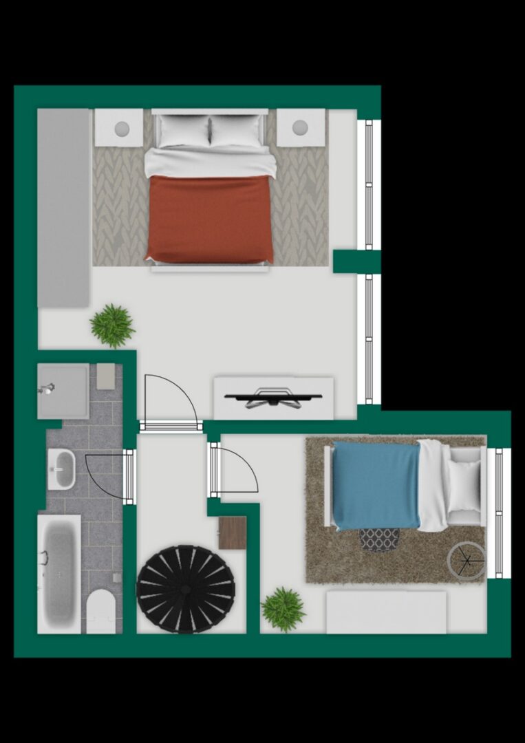 Geradeaus befindet sich das großzügige Schlafzimmer, ebenfalls mit bodentiefen Fenstern, die den Blick Richtung Park freigeben. Die ruhige Ausrichtung und die natürliche Umgebung schaffen eine besonders angenehme Atmosphäre – ein Ort, der sich perfekt als privater Rückzugsbereich eignet und jeden Tag mit einem Blick ins Grüne beginnen lässt.