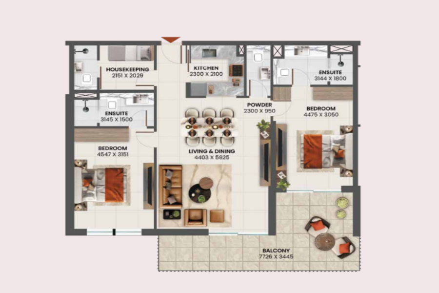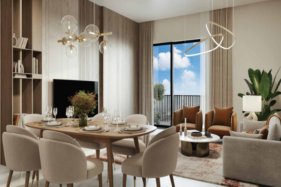 Wenn Sie diese atemberaubende Wohnung mit zwei Schlafzimmern und einem Arbeitszimmer in Sunvale by Grid Properties in Al Furjan, Dubai, betreten, werden Sie mit einem Gefühl von moderner Eleganz und Luxus begrüßt. Der offen gestaltete Wohnraum ist mit natürlichem Licht durchflutet und schafft eine warme und einladende Atmosphäre.