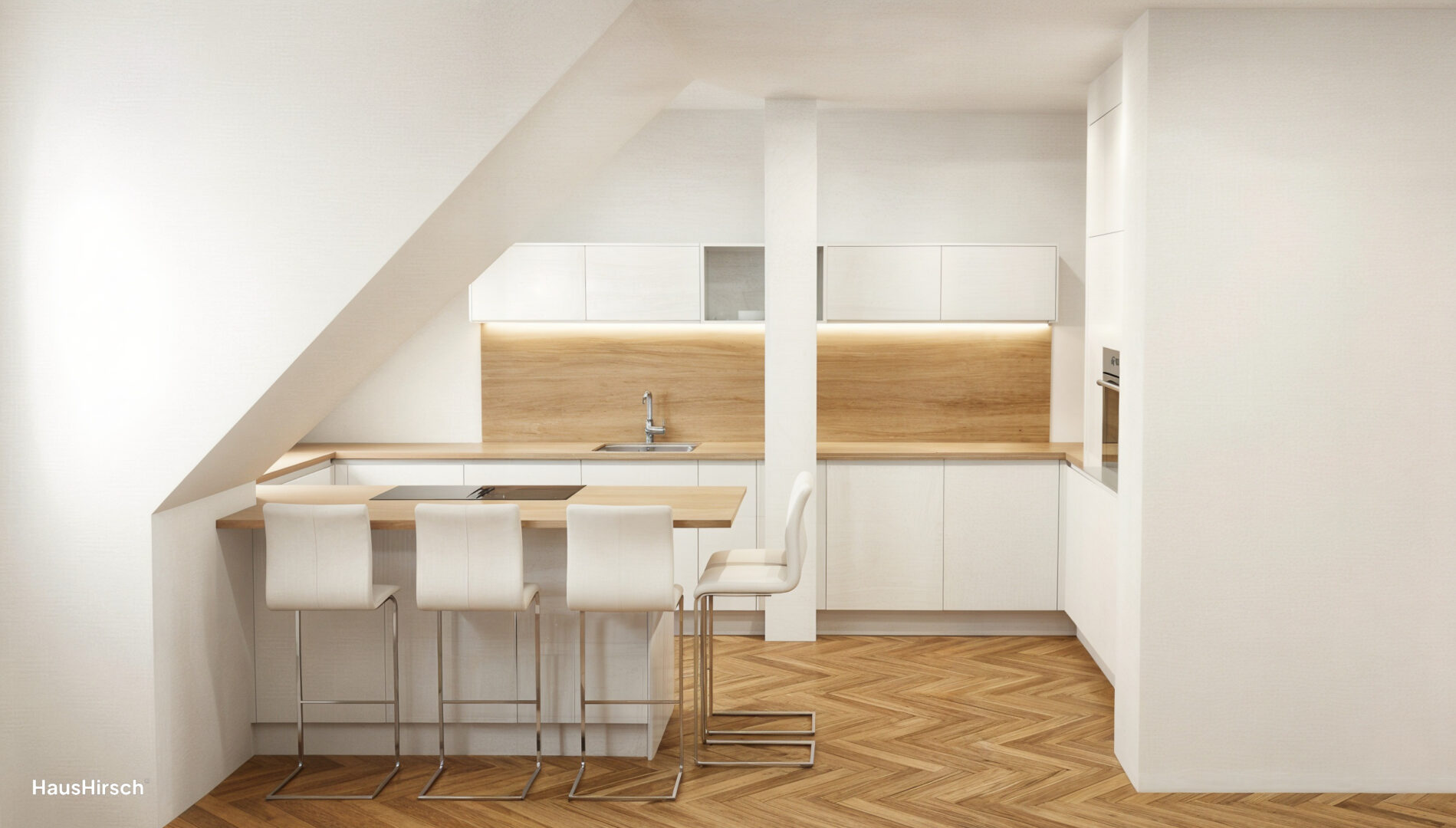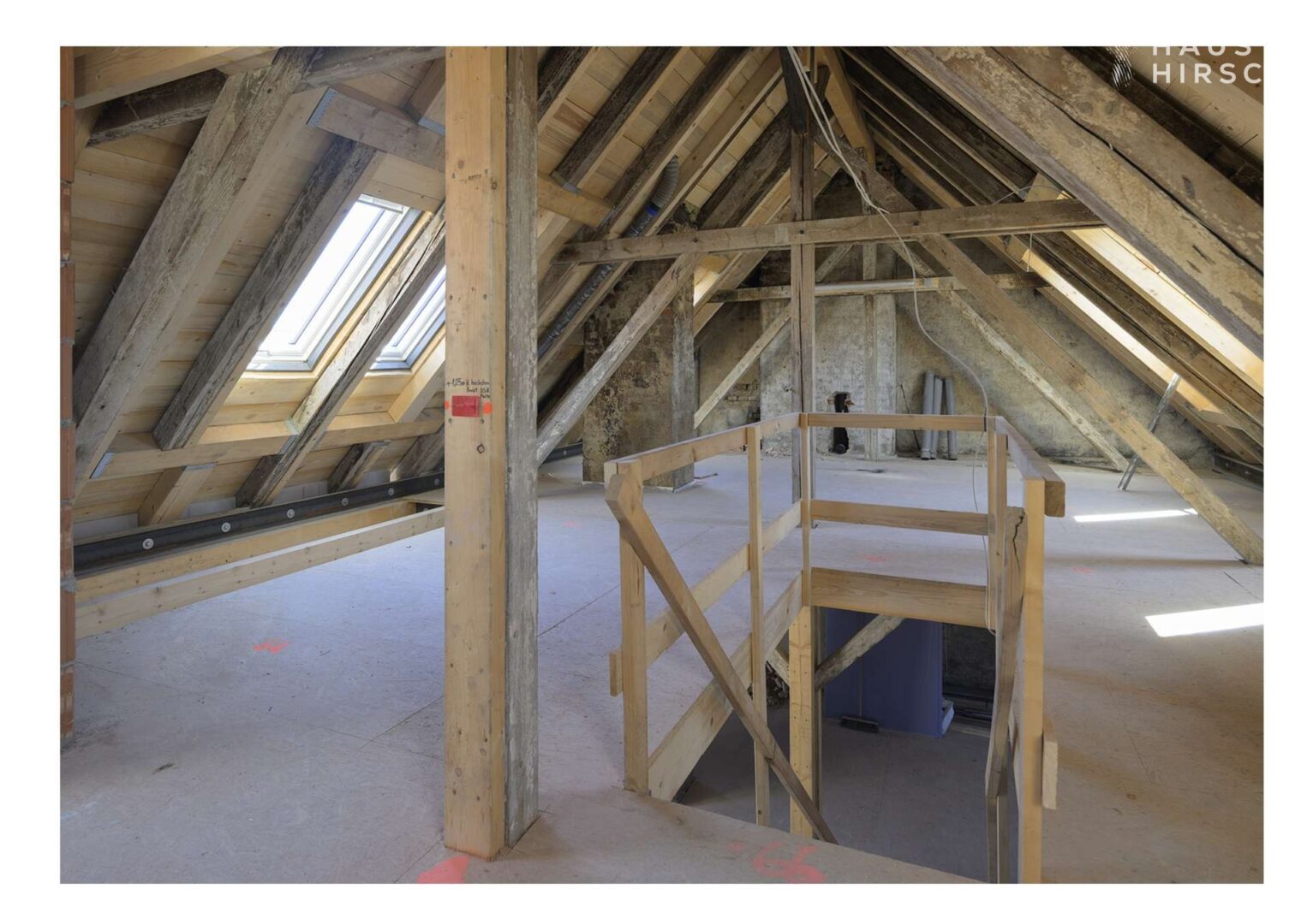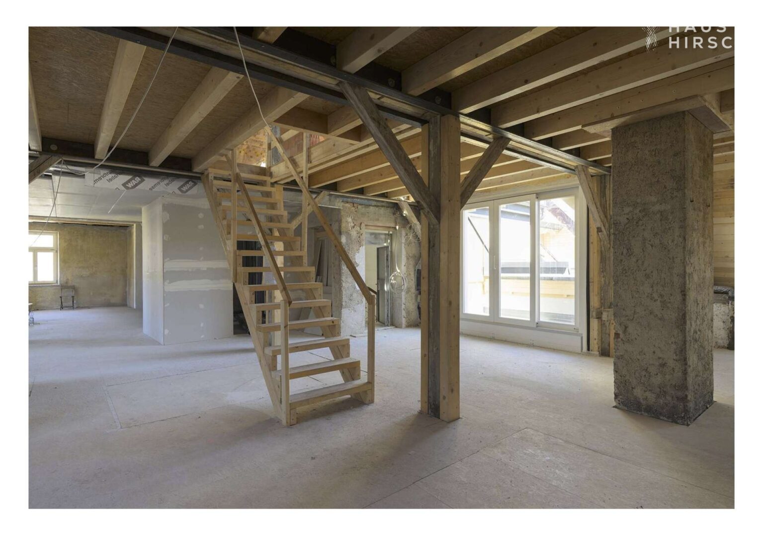Eine hochwertige Treppe führt hinauf in die zweite Ebene, wo sich der Altbau-Charme durch Sichtbalken und Dachschrägen voll entfaltet.