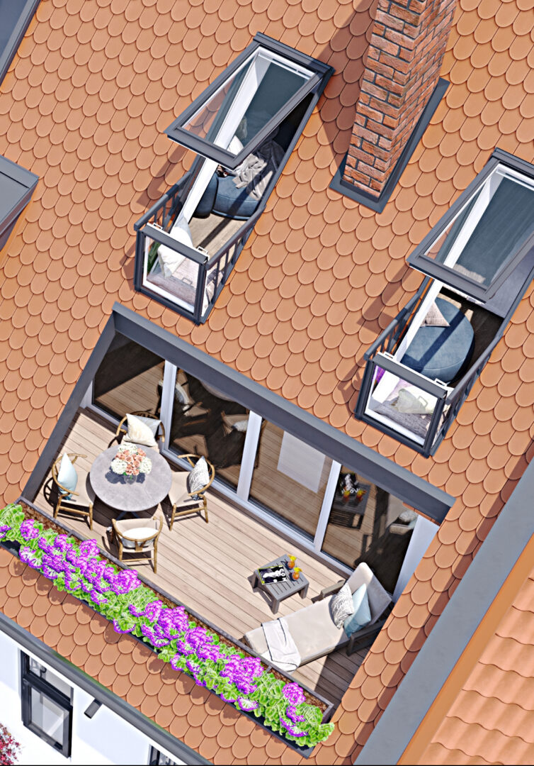- Outdoor-Lounge: Die Loggia (Dachterrasse) liegt ruhig zum grünen Innenhof ausgerichtet – der perfekte, geschützte Ort für entspannte Stunden unter freiem Himmel.