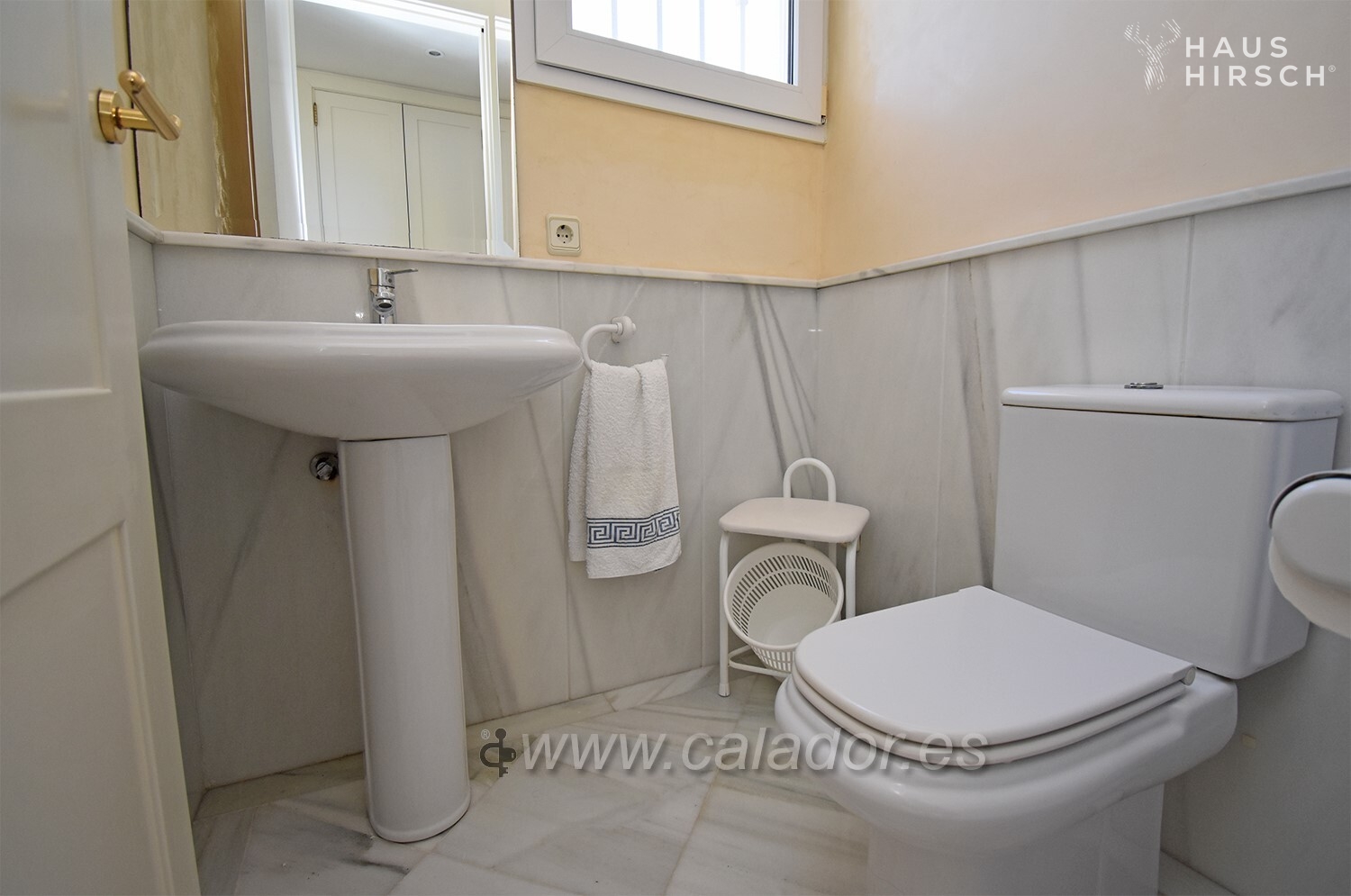 Das 938 qm große Grundstück beherbergt einen sehr gepflegten Garten mit automatischer Bewässerung sowie einen großzügigen 33 qm Pool. Auf der Terrassenfläche von insgesamt 160 m² (80 m² offen, 80 m² überdacht) kann man den Meerblick genießen. Im Obergeschoss befinden sich 2 weitere Schlafzimmer mit Bädern en Suite und eine große Terrasse mit Meerblick.