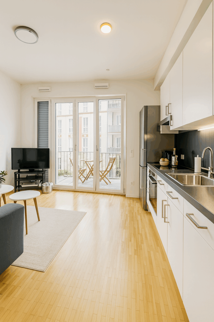 This step-free 2-room apartment with approximately 48 sqm of living space impresses with its spacious living area and open-plan Nobilia kitchen, equipped with Bosch appliances. The dining area connects seamlessly to the living space and leads directly to the balcony. A separate, light-filled bedroom and a modern bathroom with bathtub, toilet, and washing machine connection provide additional comfort. Underfloor heating and high-quality flooring ensure a cozy atmosphere throughout. An automatic ventilation system and electric shutters in all rooms are also noteworthy.