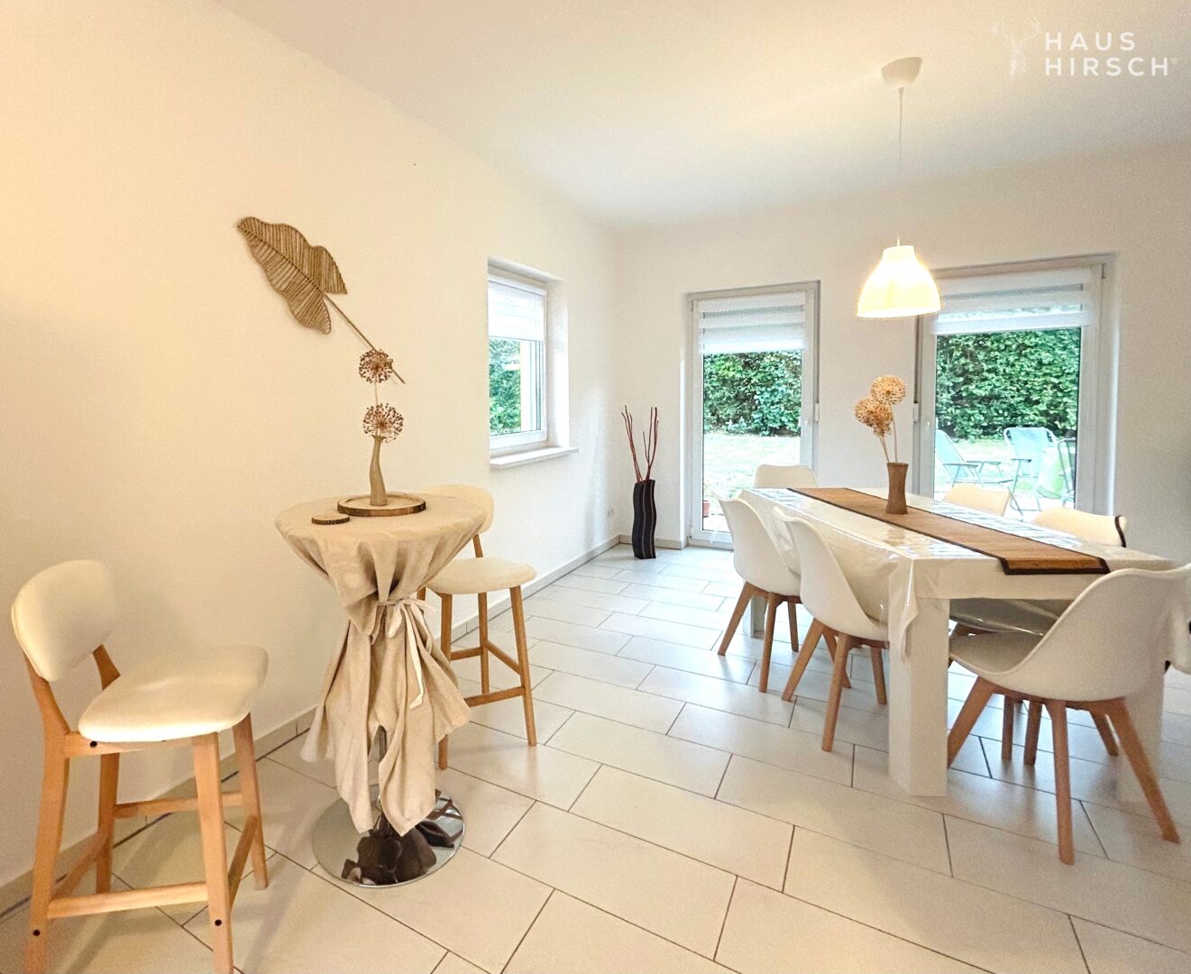 Die angrenzende Küche präsentiert sich als Herzstück des Hauses und bietet mit modernen Geräten und einer durchdachten Anordnung die ideale Kulisse für gemeinsame Mahlzeiten.