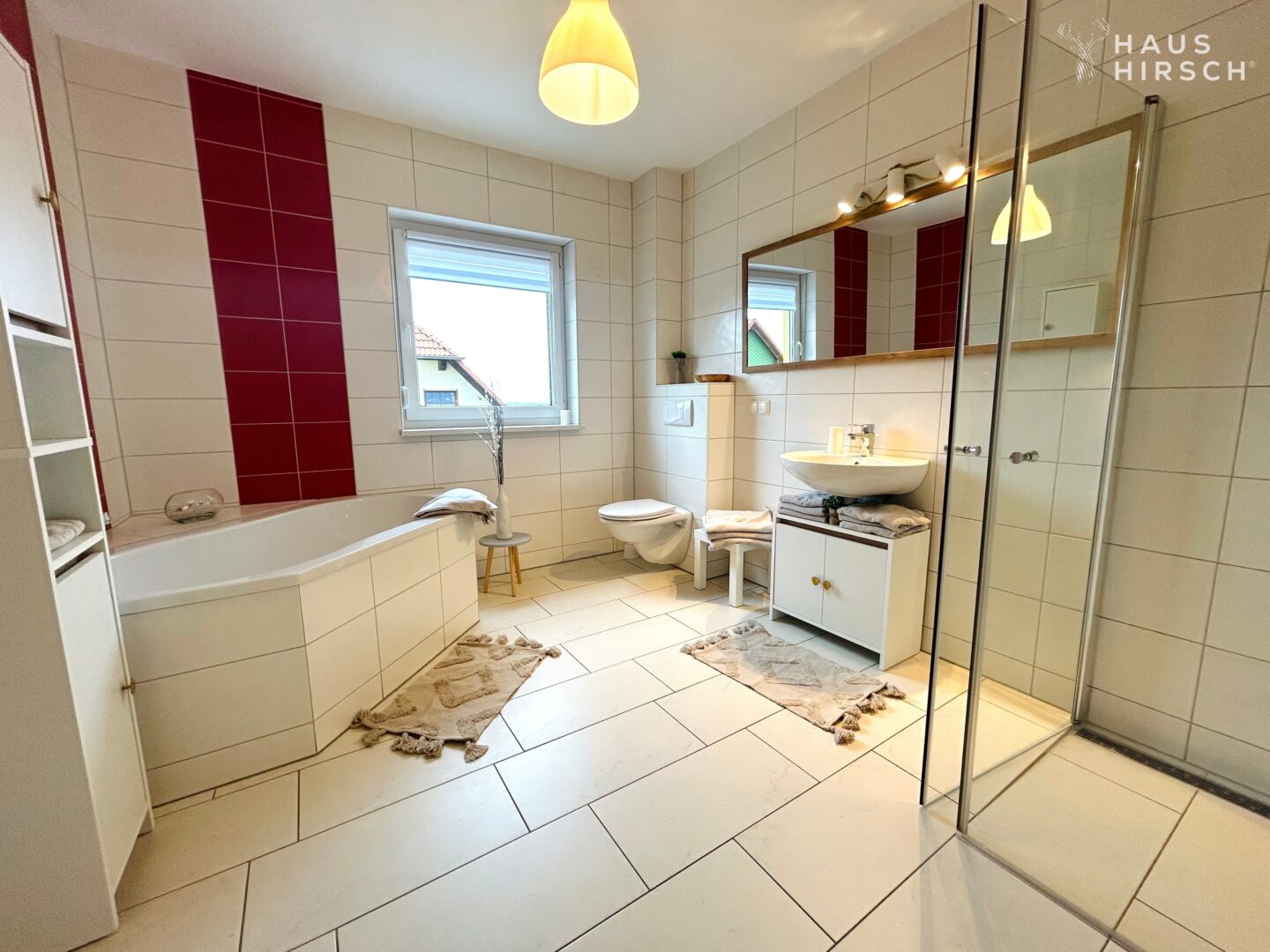 Das Highlight des Obergeschosses ist zweifellos das großzügige Badezimmer, das mit einer guten Ausstattung besticht. Eine Eckbadewanne lädt zu entspannenden Bädern ein, während eine separate Dusche für erfrischende Momente sorgt. Hier wird der Alltag zur Wellness-Oase.