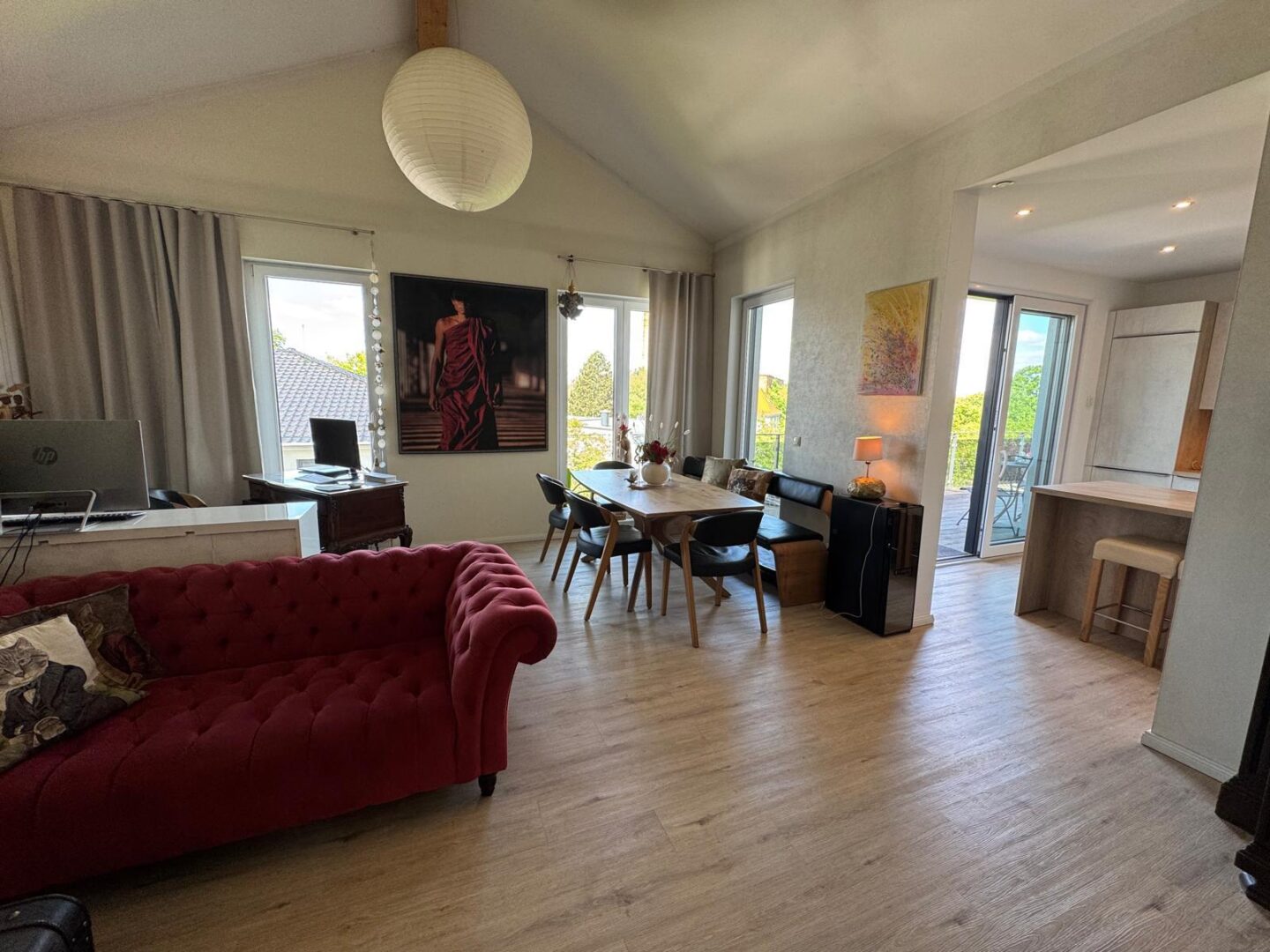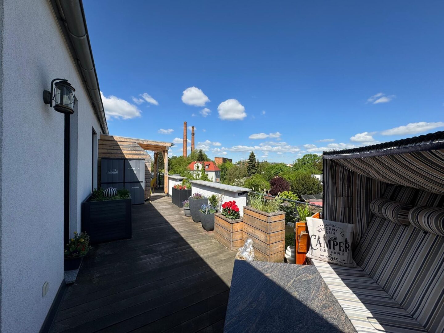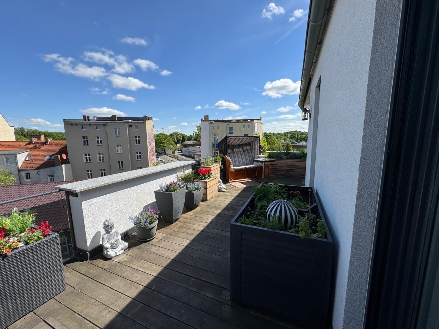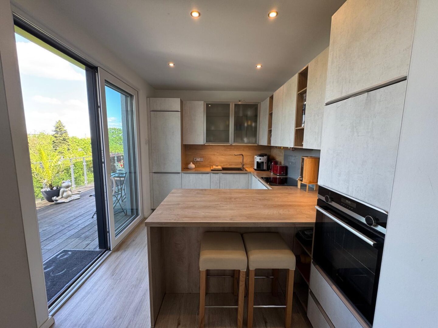 Die offene Küche mit direktem Zugang zur 60 qm großen Dachterrasse bietet Ihnen die Möglichkeit, Ihre Gäste in einem stilvollen Ambiente zu empfangen. Hochwertige, durchdachte Einrichtung sorgt für ein einladendes Wohngefühl, während die Terrassenmöbel auf der Dachterrasse zum Verweilen im Freien einladen.