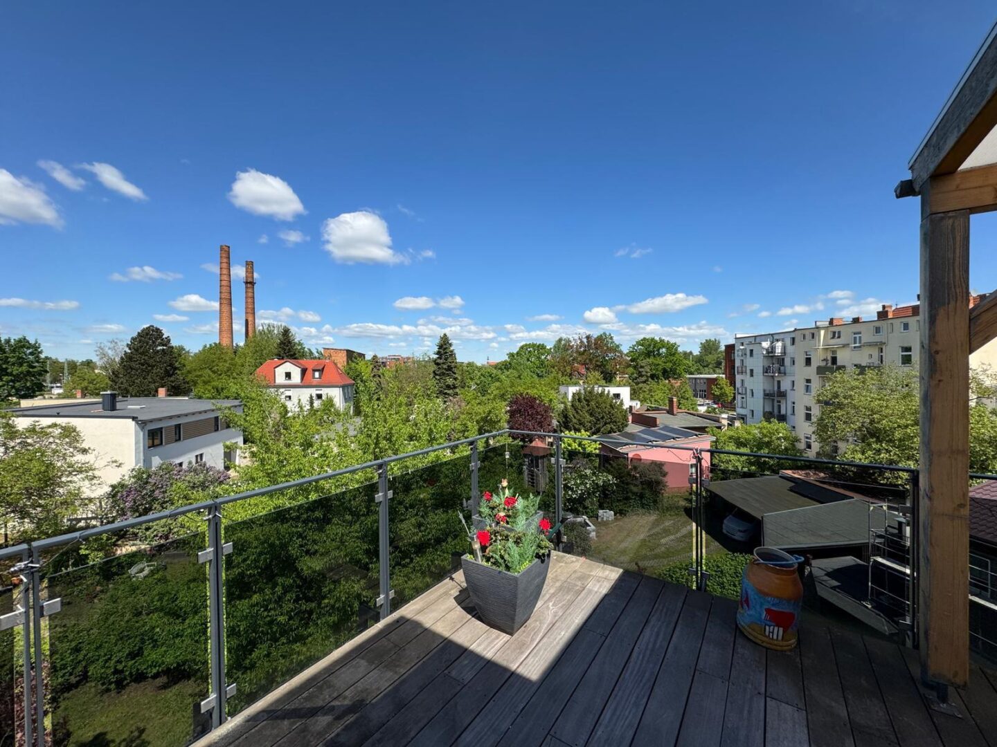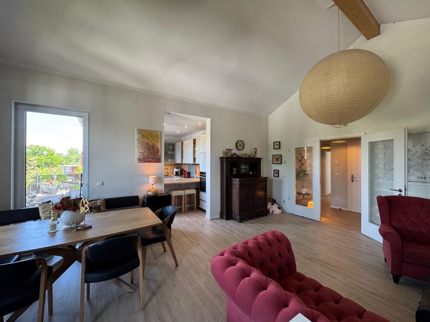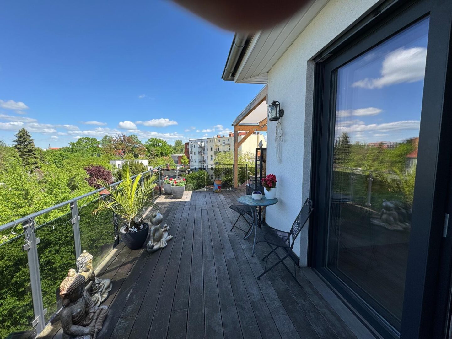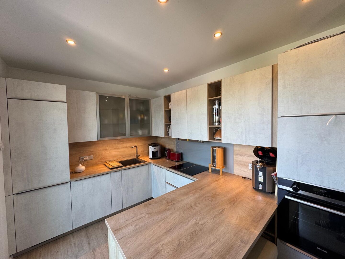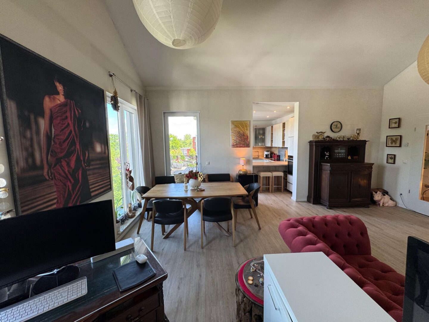 Die offene Küche mit direktem Zugang zur 60 qm großen Dachterrasse bietet Ihnen die Möglichkeit, Ihre Gäste in einem stilvollen Ambiente zu empfangen. Hochwertige, durchdachte Einrichtung sorgt für ein einladendes Wohngefühl, während die Terrassenmöbel auf der Dachterrasse zum Verweilen im Freien einladen.