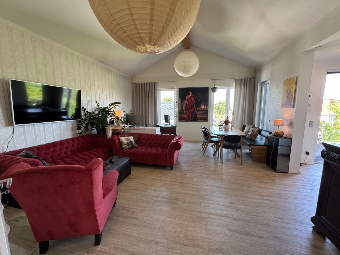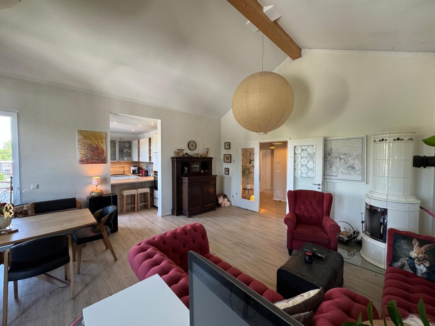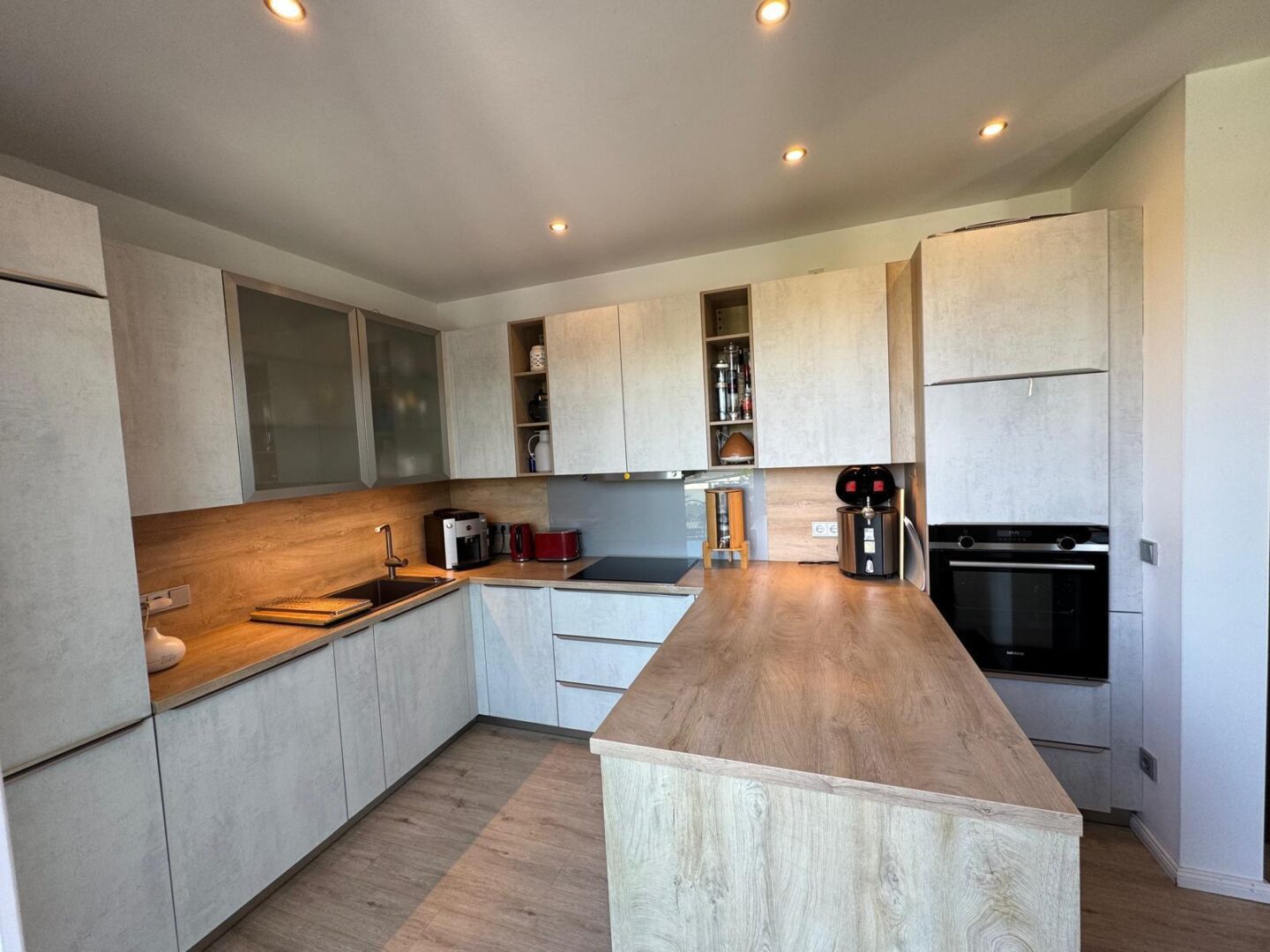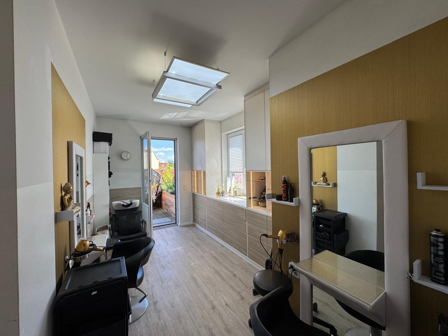 Die offene Küche mit direktem Zugang zur 60 qm großen Dachterrasse bietet Ihnen die Möglichkeit, Ihre Gäste in einem stilvollen Ambiente zu empfangen. Hochwertige, durchdachte Einrichtung sorgt für ein einladendes Wohngefühl, während die Terrassenmöbel auf der Dachterrasse zum Verweilen im Freien einladen.
