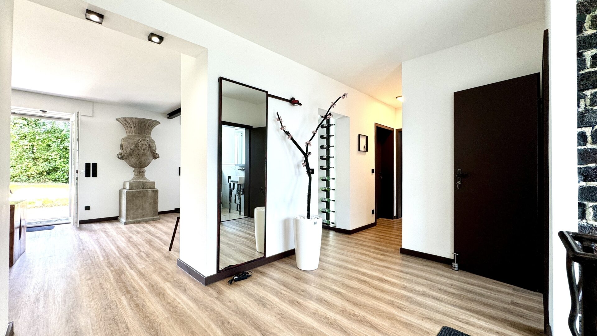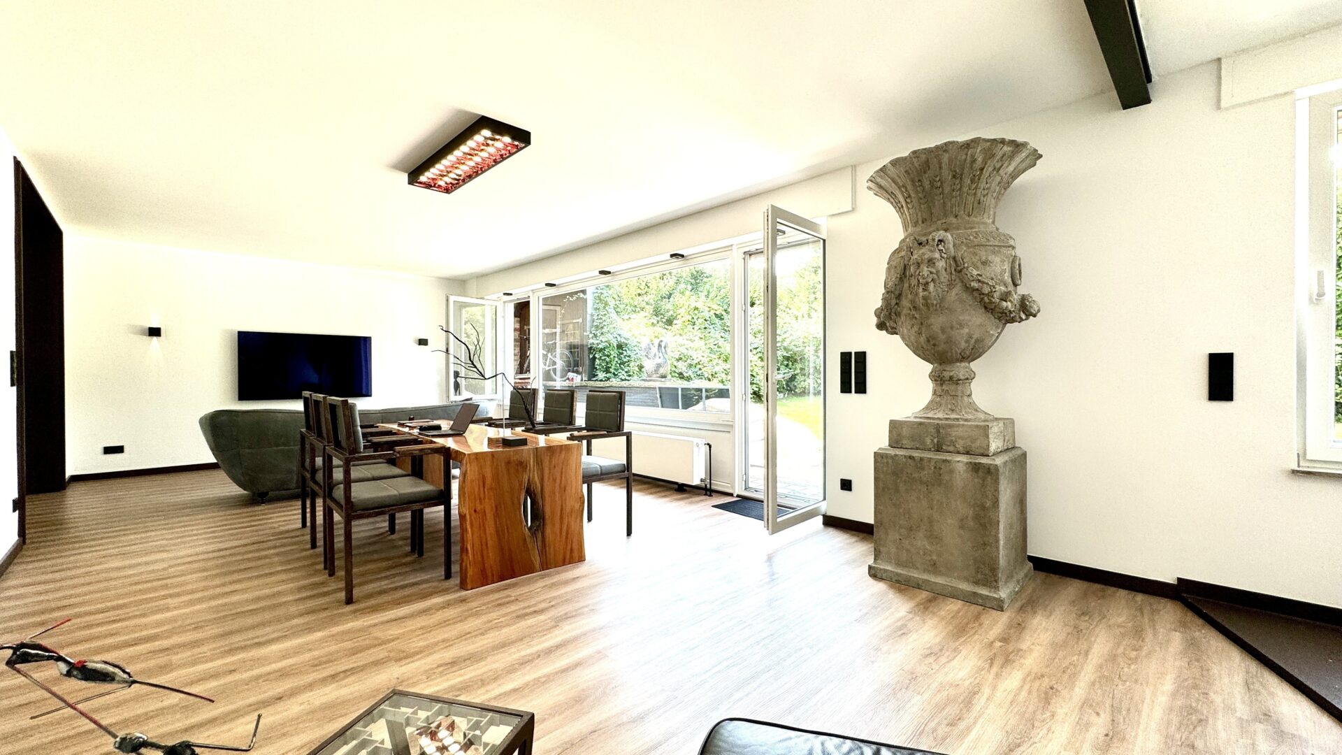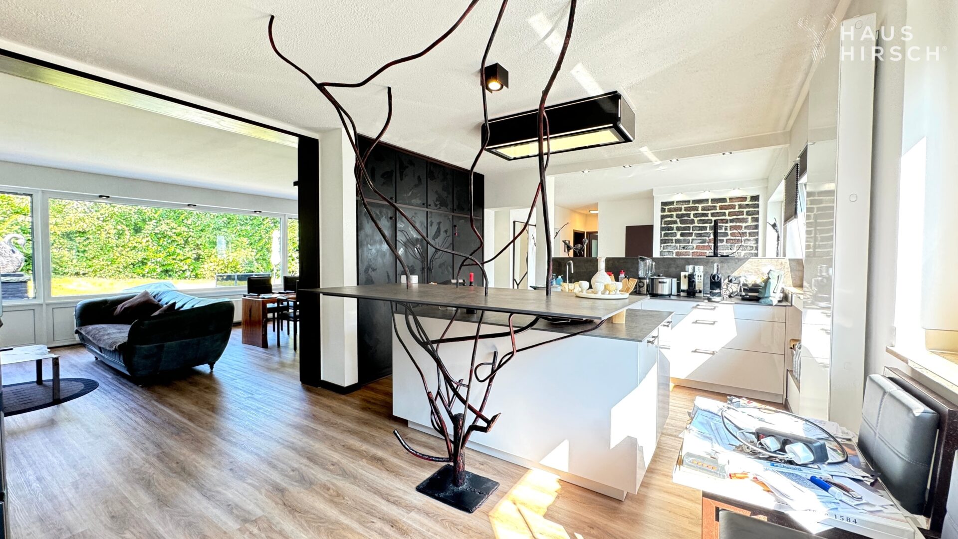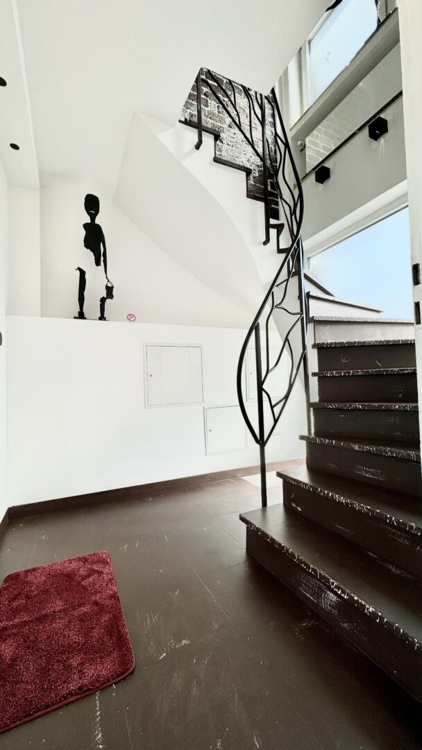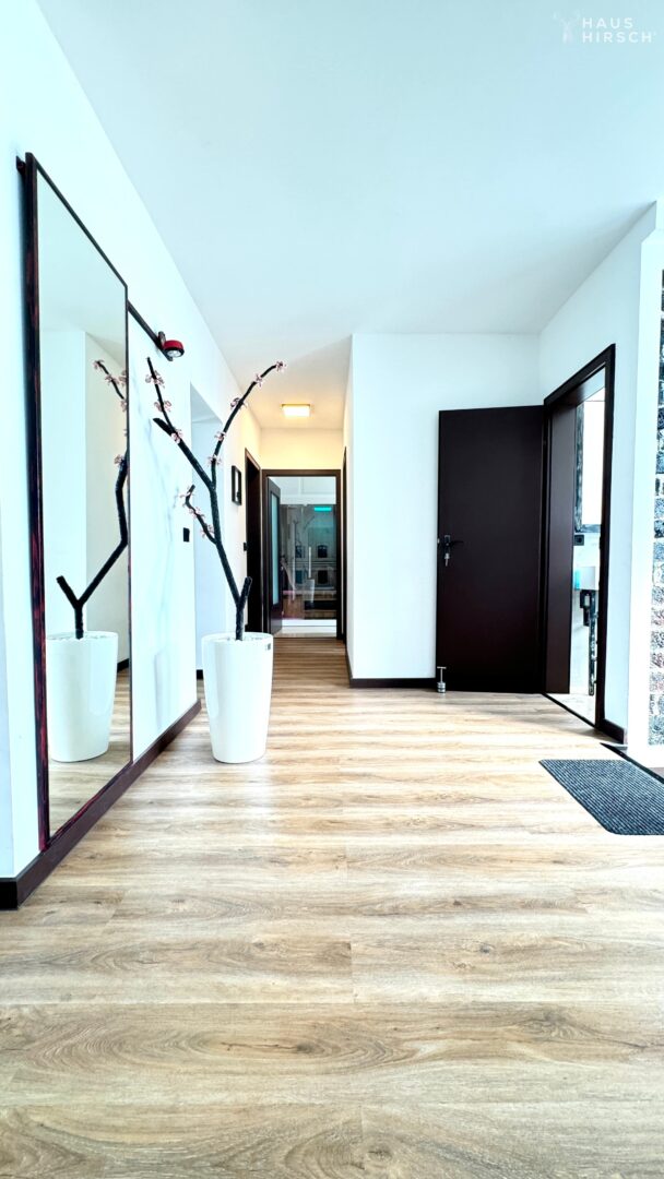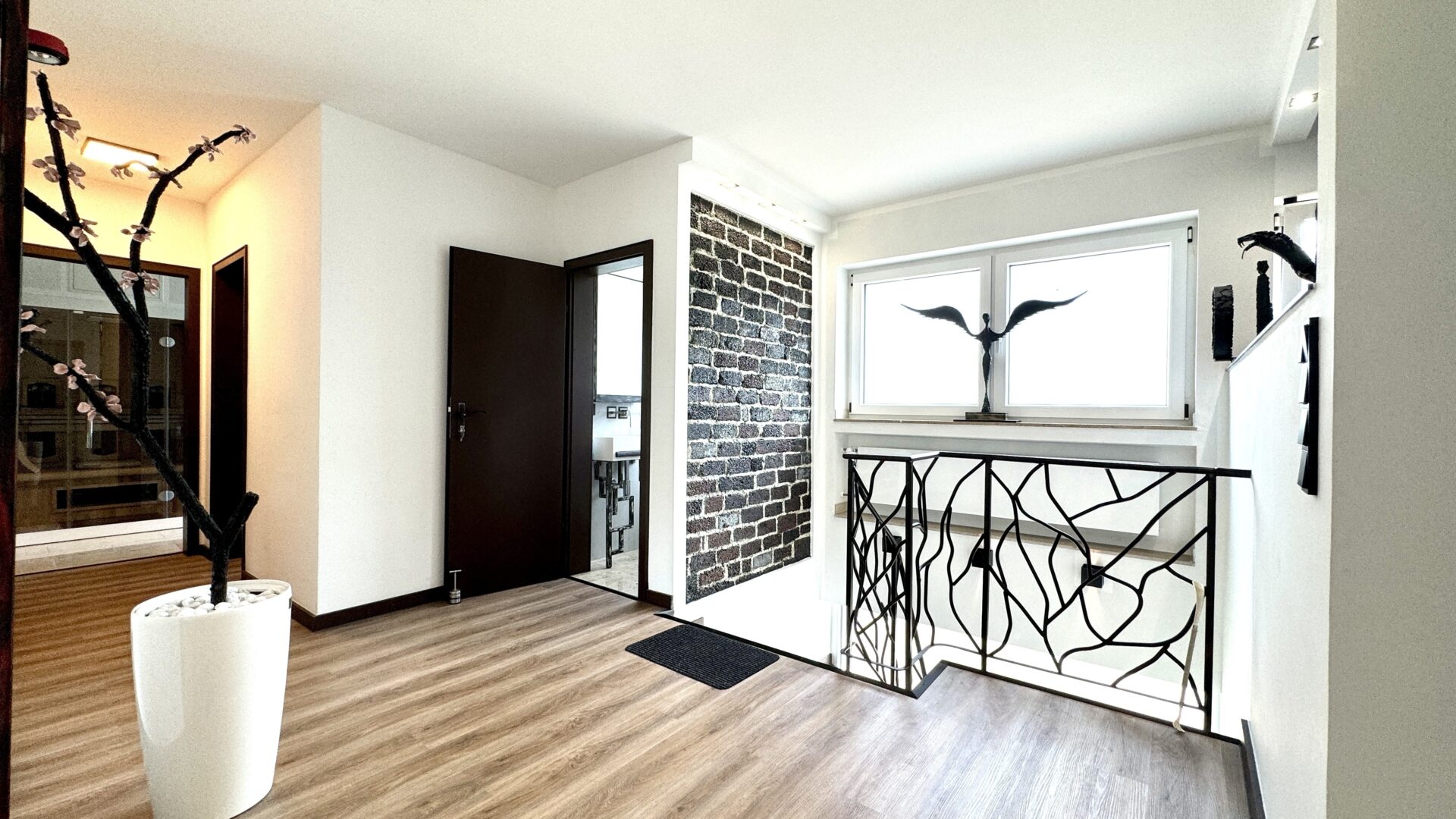 Treten Sie ein in dieses einzigartige Designer-Anwesen mit einer Wohnfläche von 231,45 m2 und lassen Sie sich von dem eleganten künstlerischen Ambiente begeistern. Der Eingangsbereich in filigraner weiss-anthrazit-farbener Optik und LED-Spots sowie die aufgearbeitete Steintreppe mit handgefertigtem Stahlgeländer heißen Sie herzlich willkommen. Die Böden aus Marmor, Feinsteinfliesen und Design-Vinyl strahlen Luxus aus.
