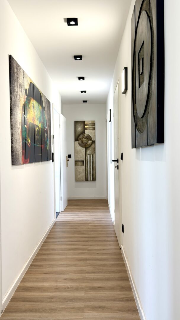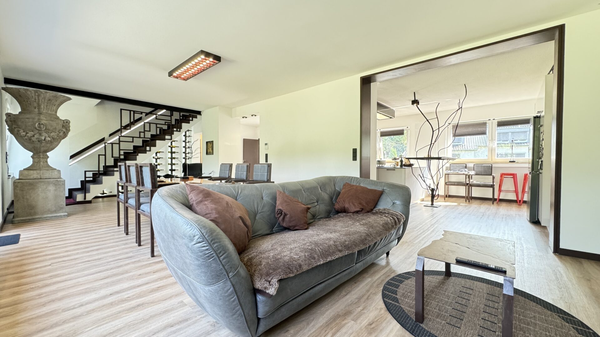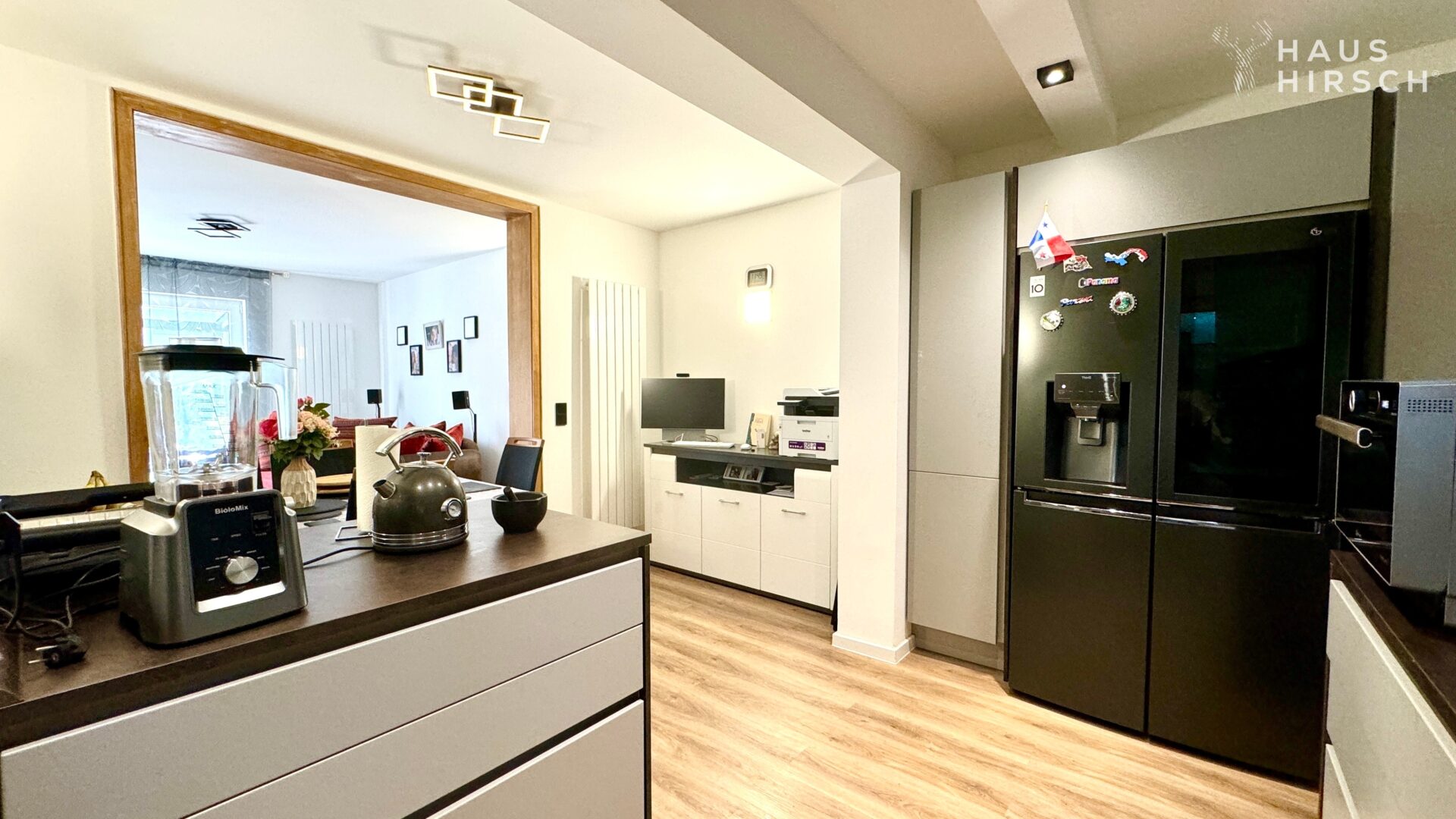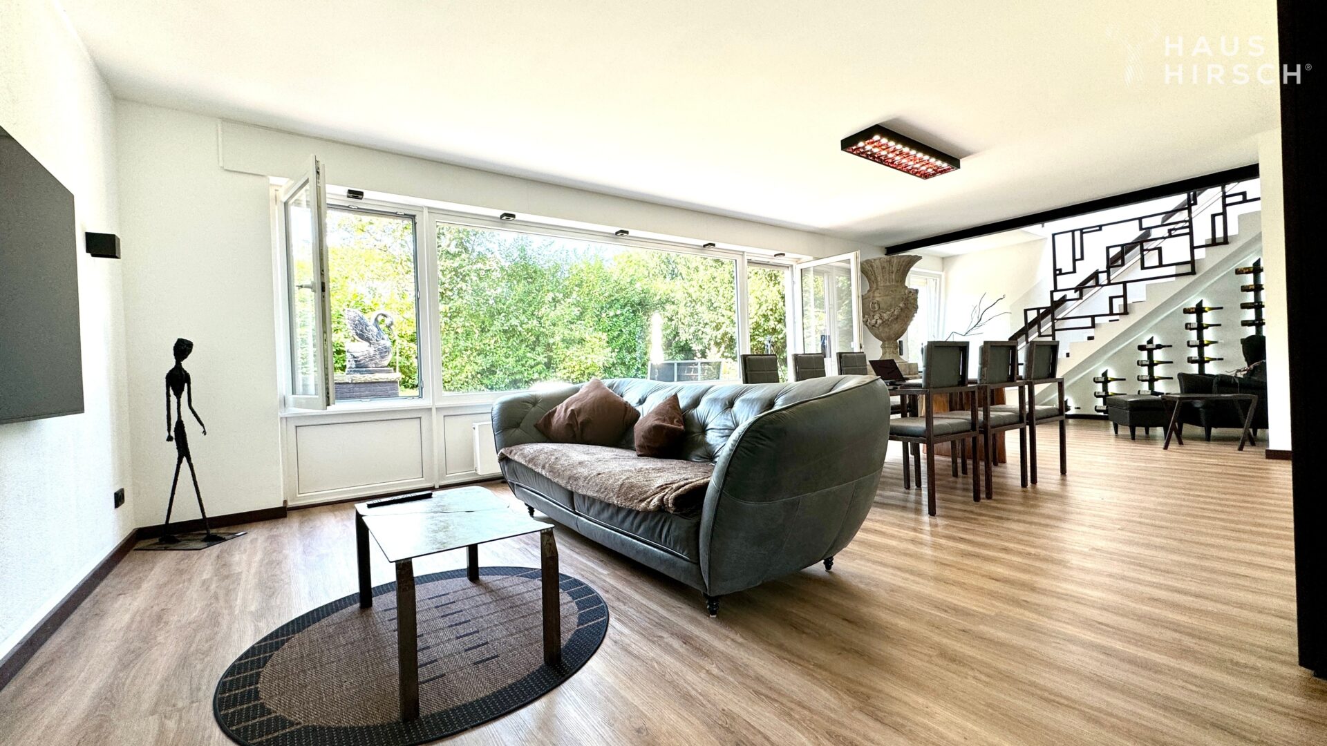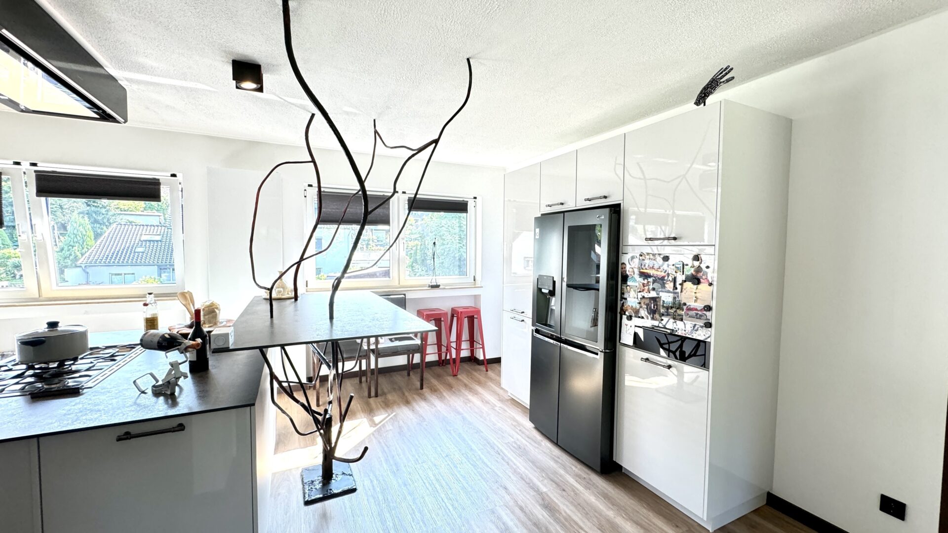 Treten Sie ein in dieses einzigartige Designer-Anwesen mit einer Wohnfläche von 231,45 m2 und lassen Sie sich von dem eleganten künstlerischen Ambiente begeistern. Der Eingangsbereich in filigraner weiss-anthrazit-farbener Optik und LED-Spots sowie die aufgearbeitete Steintreppe mit handgefertigtem Stahlgeländer heißen Sie herzlich willkommen. Die Böden aus Marmor, Feinsteinfliesen und Design-Vinyl strahlen Luxus aus.