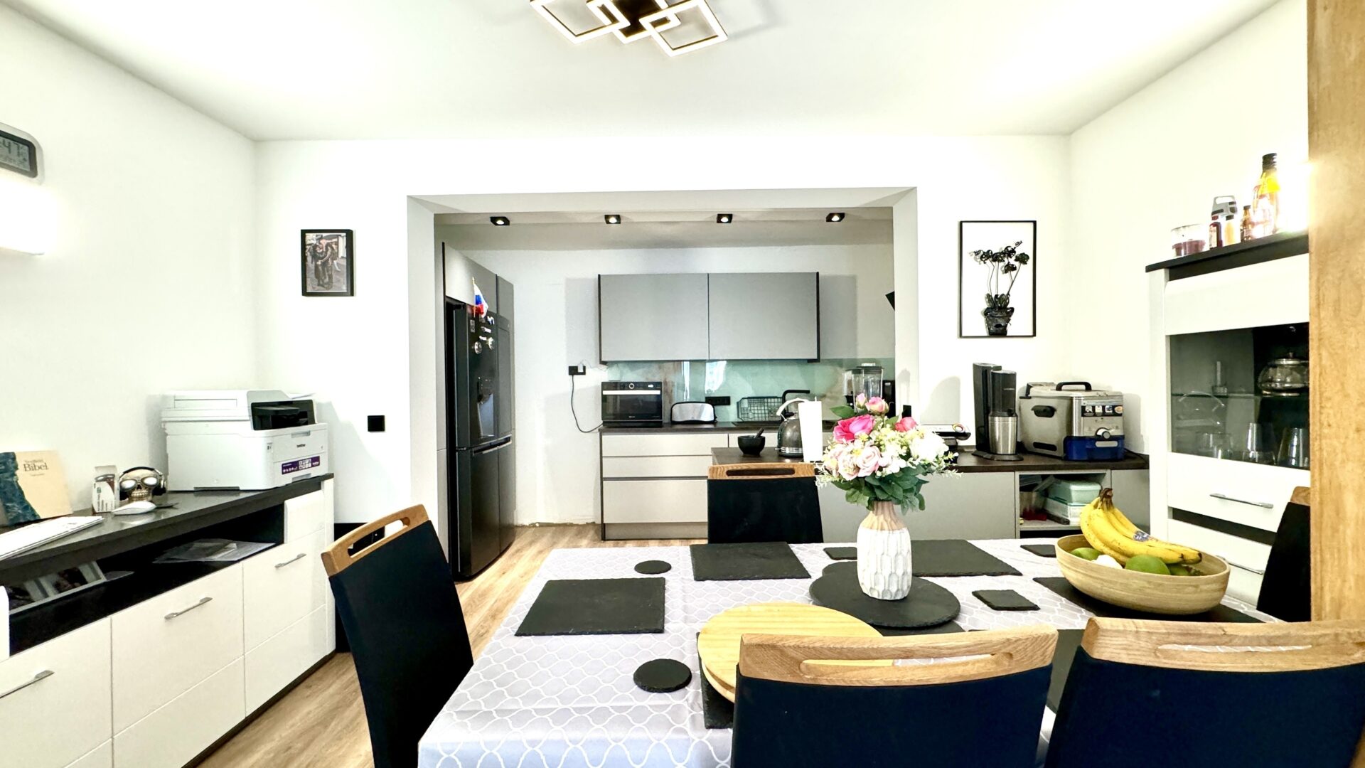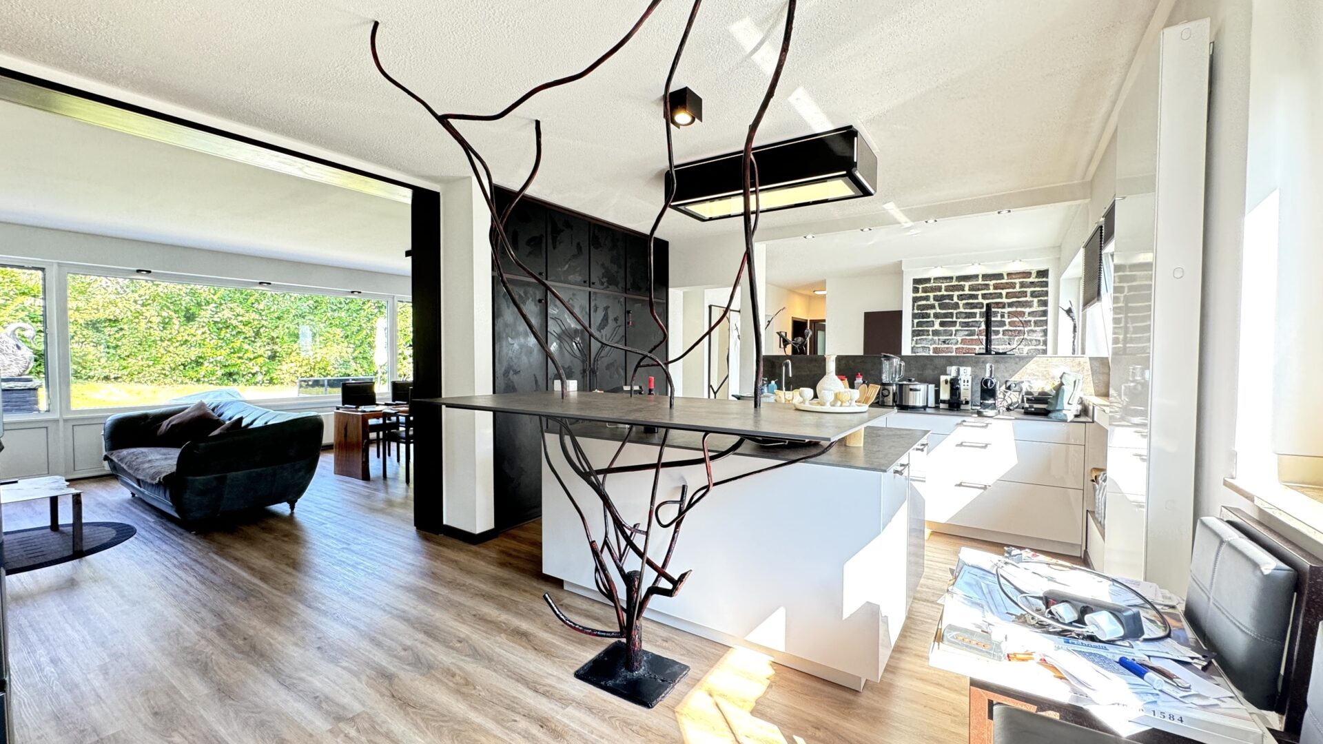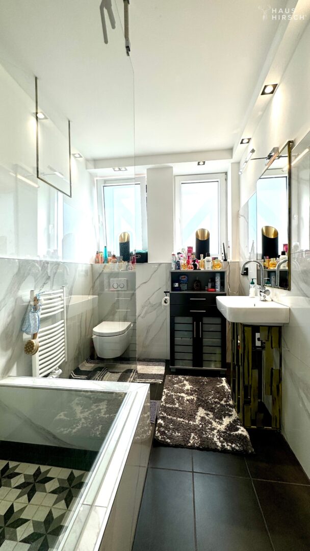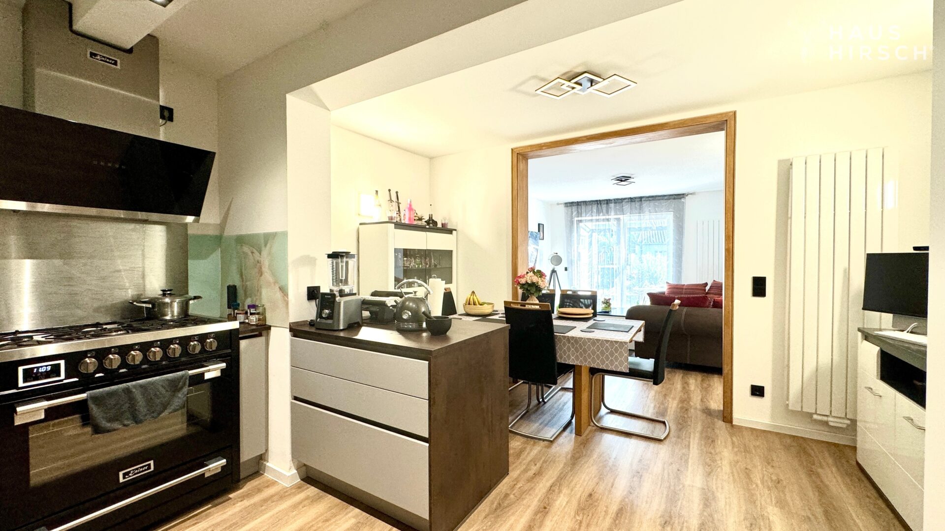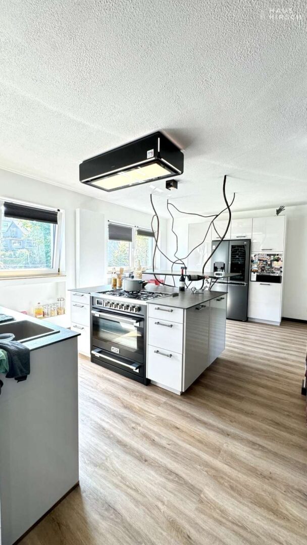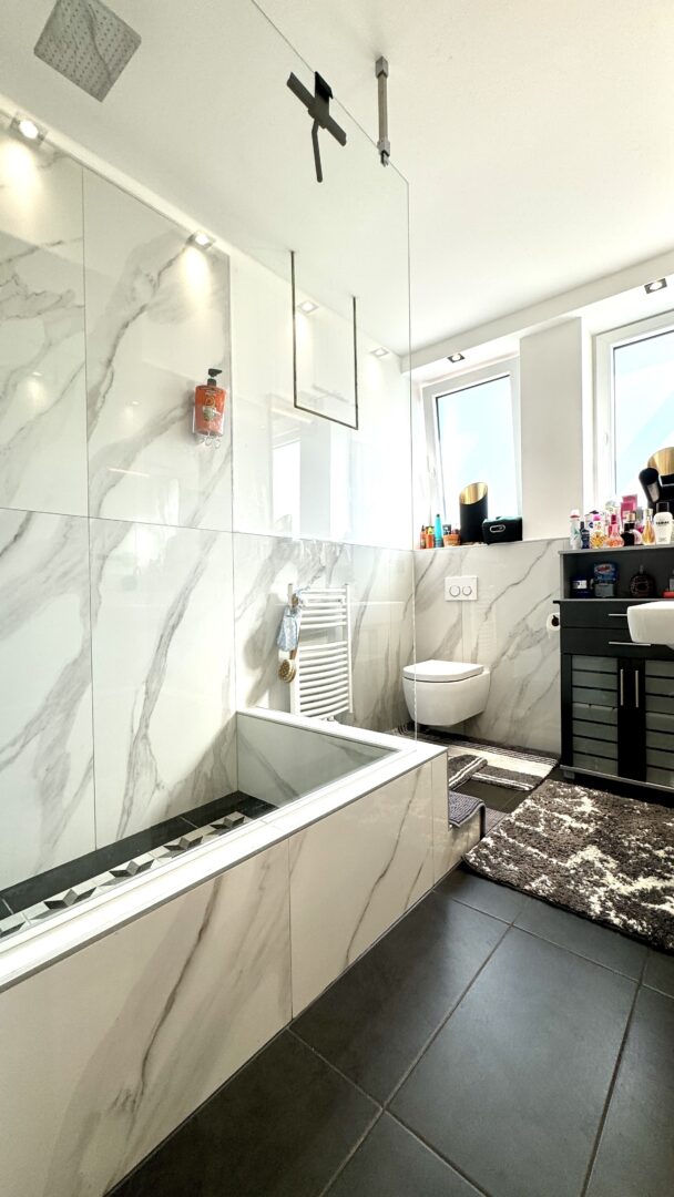 Treten Sie ein in dieses einzigartige Designer-Anwesen mit einer Wohnfläche von 231,45 m2 und lassen Sie sich von dem eleganten künstlerischen Ambiente begeistern. Der Eingangsbereich in filigraner weiss-anthrazit-farbener Optik und LED-Spots sowie die aufgearbeitete Steintreppe mit handgefertigtem Stahlgeländer heißen Sie herzlich willkommen. Die Böden aus Marmor, Feinsteinfliesen und Design-Vinyl strahlen Luxus aus.