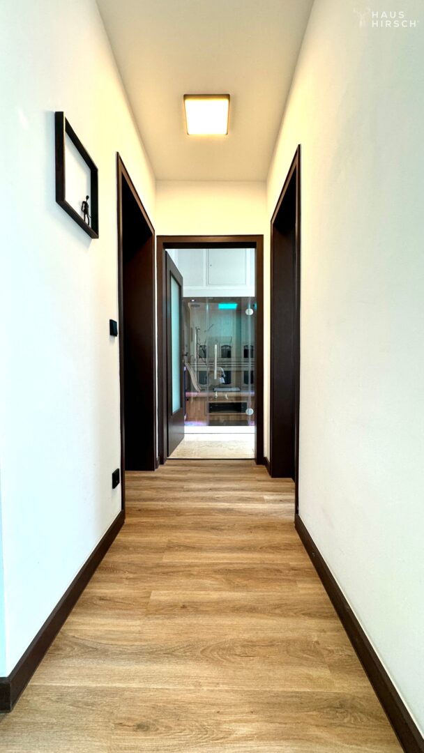 Vom Flur im 1 Geschoss gelangen Sie zum Gäste WC, dem Arbeits- und Schlafzimmer, sowie zum Luxus-Dusch-Bad mit Sauna und Bidet.