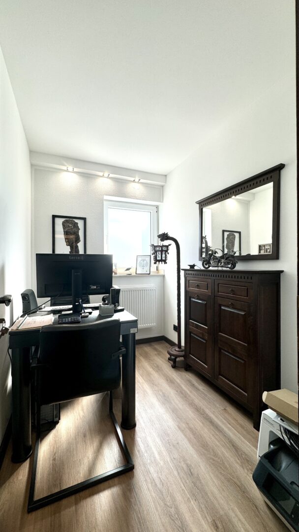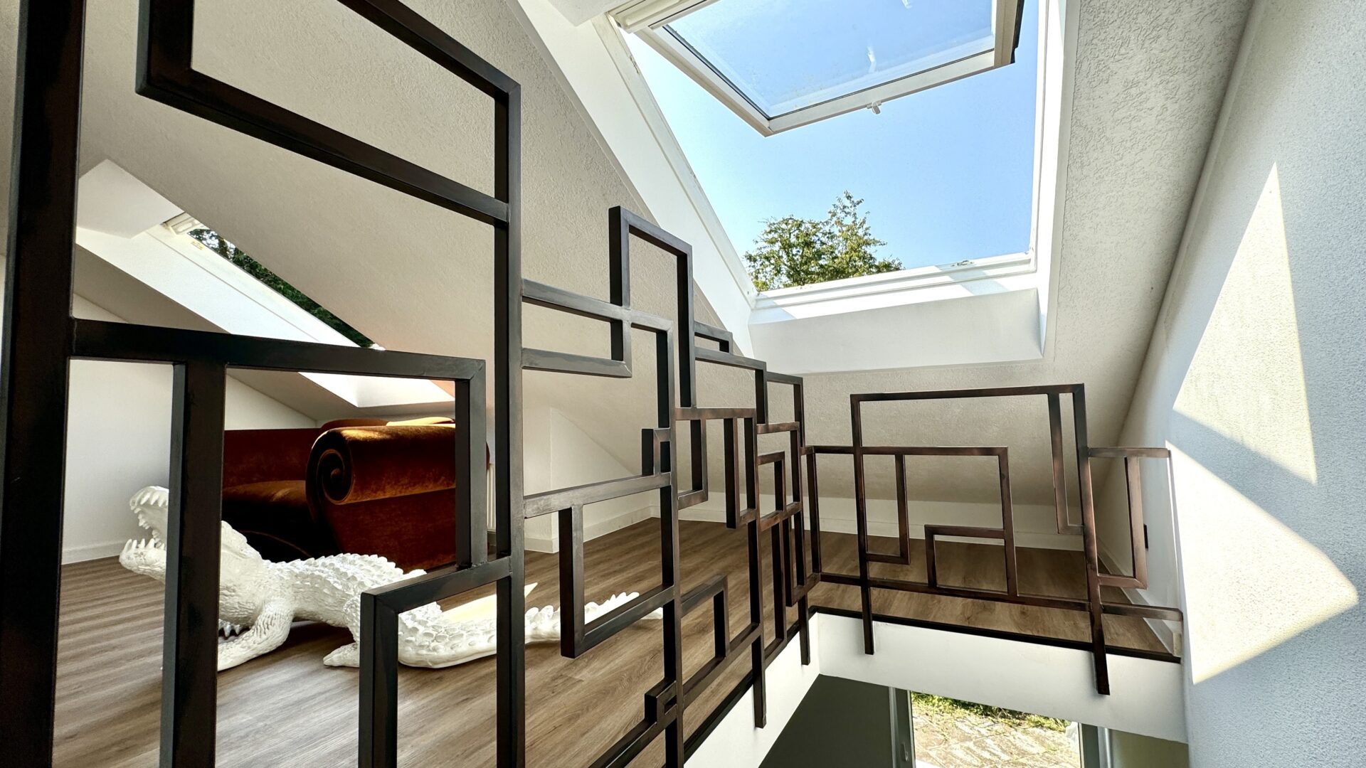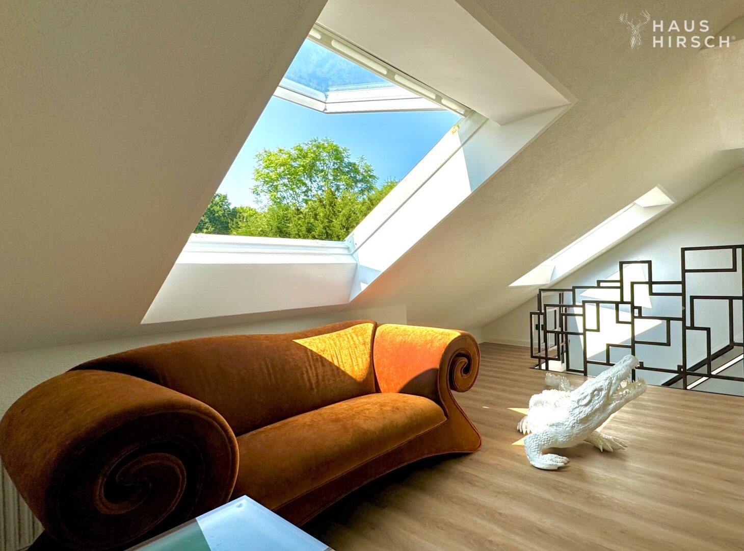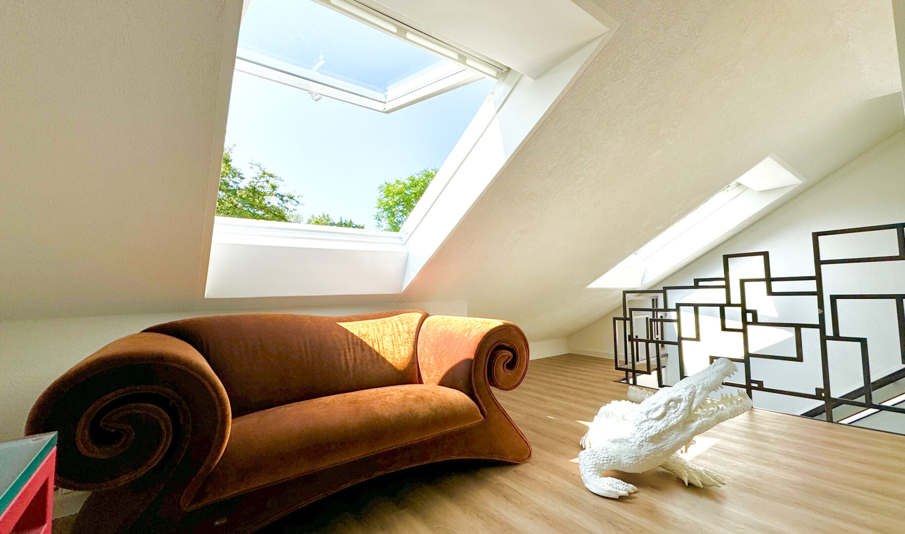 Im ausgebauten Dachgeschoss befinden sich zwei weitere Zimmer und ein geräumiges Durchgangszimmer. Die hochwertigen Velux-Dachfenster mit Sonnenschutzrollos sorgen für eine angenehme Lichtdurchflutung.