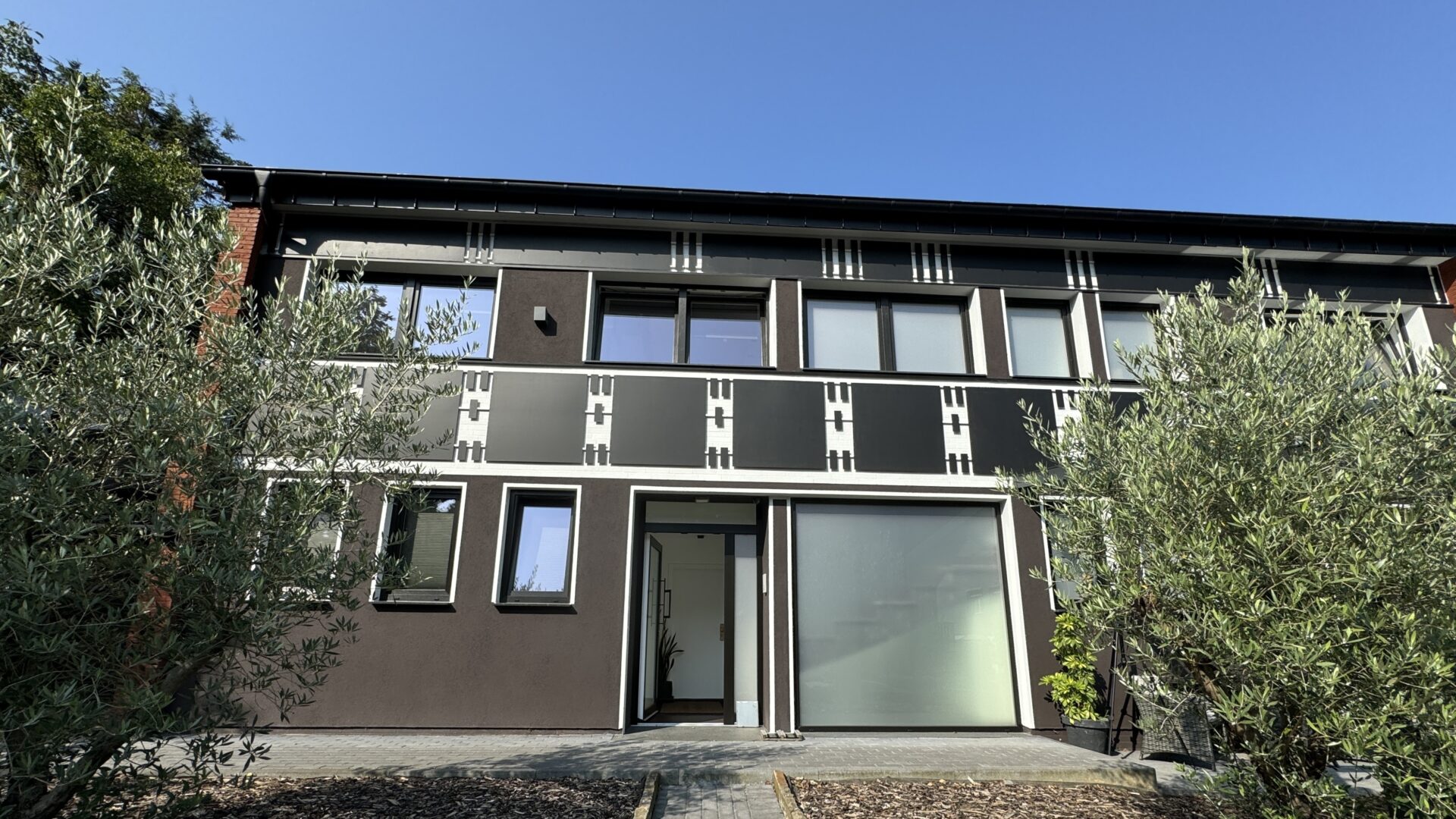 - Einzigartige Fassade in schwarz- roter Optik und Milchglasfenster,