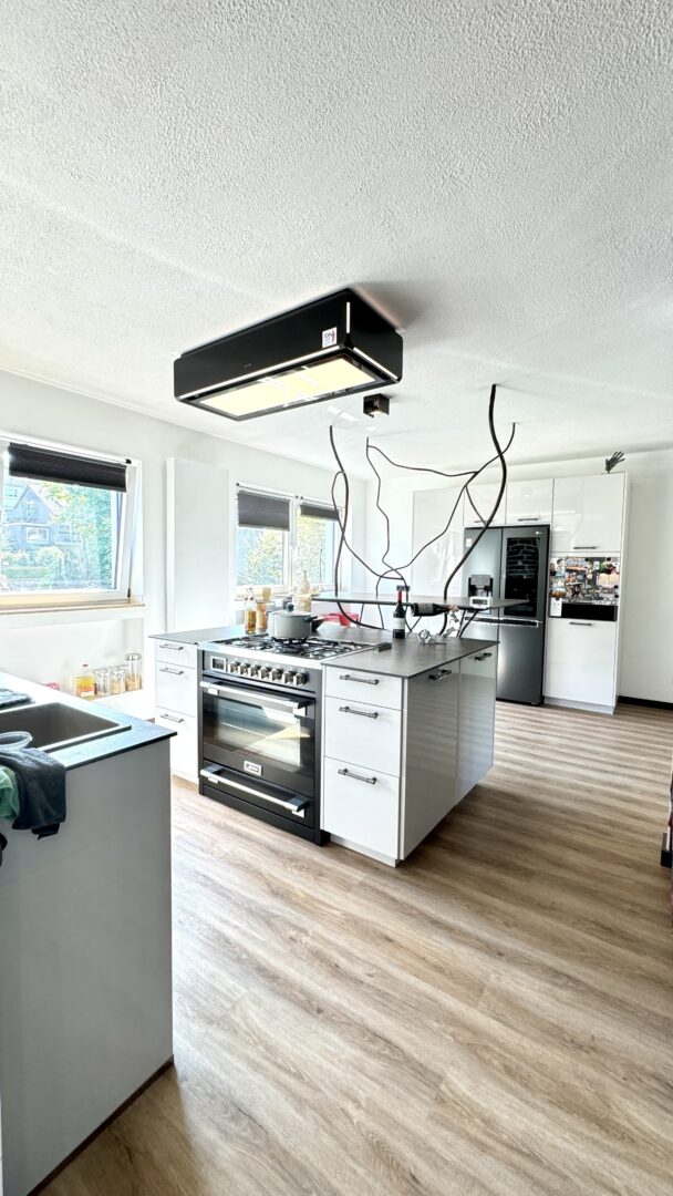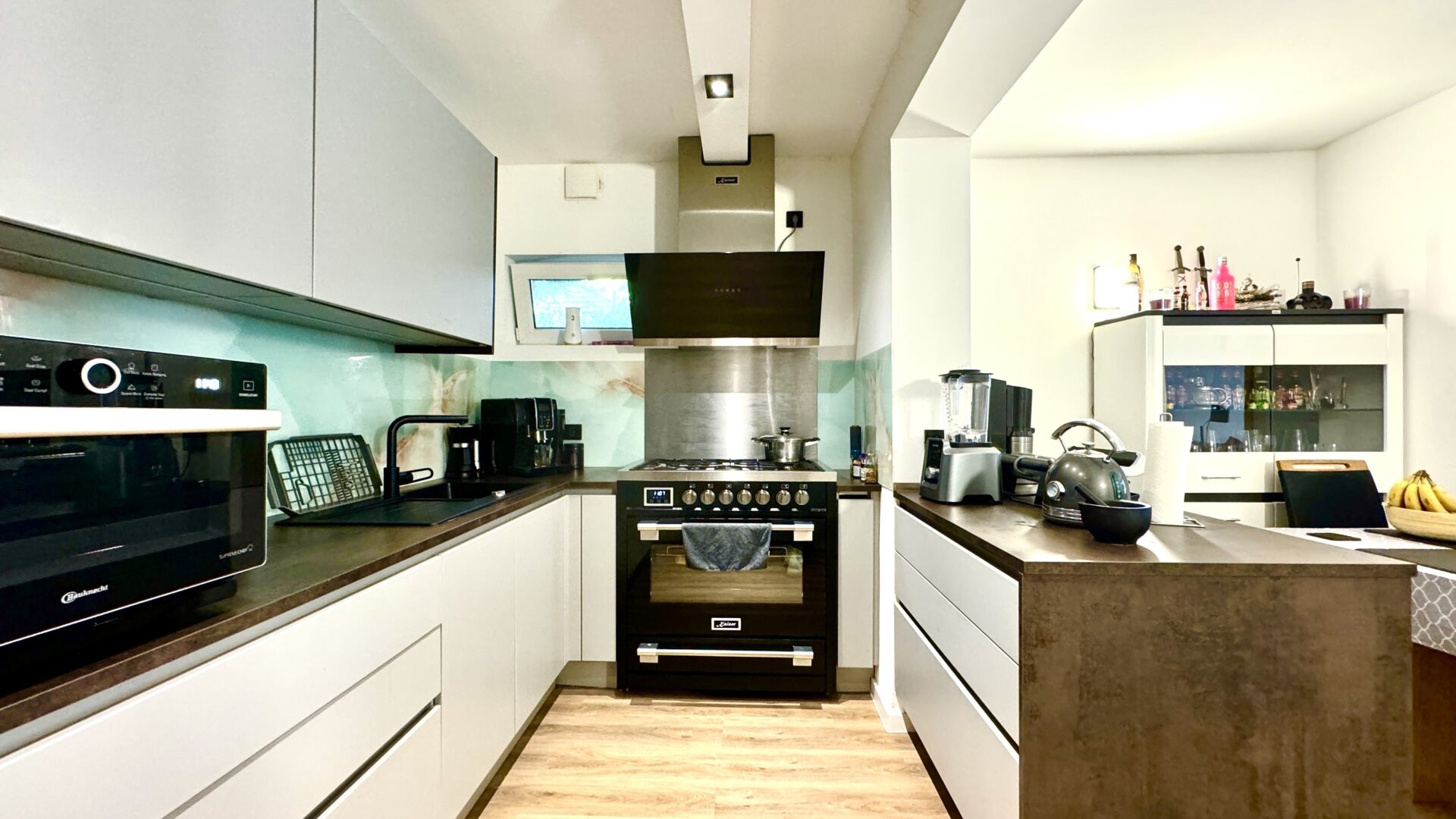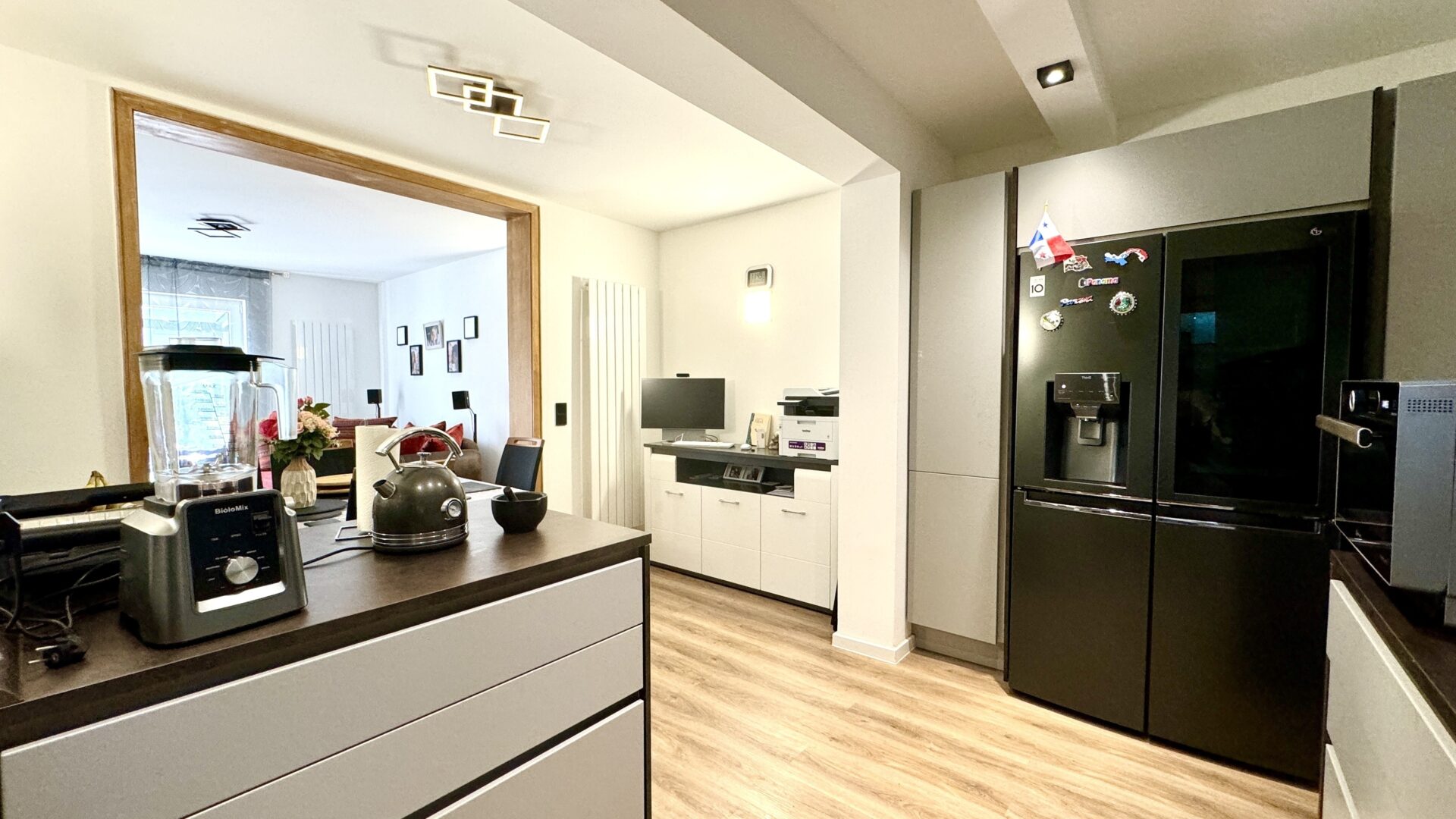 Die hochwertige Küche mit schwarzen Designelementen und einem Side-by-Side Kühlschrank LG mit InstaView Door-in-Door, lädt zum Kochen und Genießen ein. Weitere Highlights sind die automatisch absenkbare und beleuchtete Dunstabzugshaube sowie der Luxus-Gasherd mit 5 Kochzonen.
