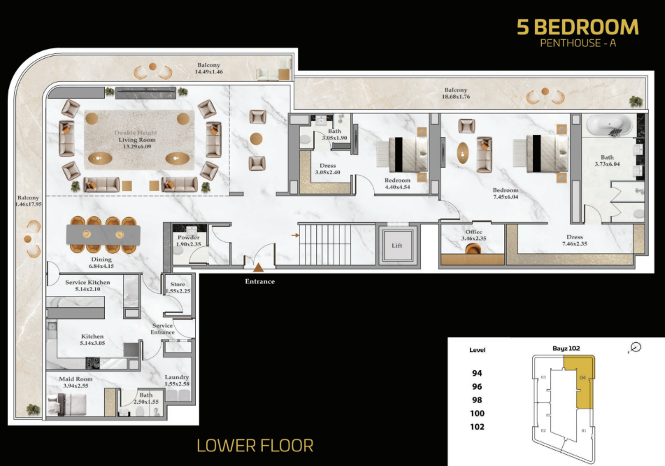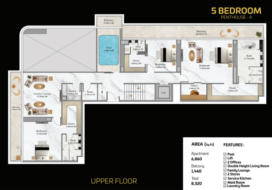 Wenn Sie dieses luxuriöse 5-Schlafzimmer-Penthouse betreten, werden Sie von einer atemberaubenden Reihe von Pools und Wasserspielen begrüßt. Der Infinity-Pool bietet einen atemberaubenden Blick auf die Skyline der Stadt, während der Innenpool eine friedliche Oase der Entspannung ist. Der Außenpool eignet sich perfekt für ein erfrischendes Bad an einem sonnigen Tag, und der Außenpool für Kinder und das Planschbecken für Kleinkinder sorgen dafür, dass die ganze Familie das Wasser mit Stil genießen kann. Das Aqua-Spa und der Jacuzzi bieten Entspannung und Verwöhnung pur. Für Fitness- und Sportbegeisterte hat dieses Penthouse alles zu bieten. Ein Fitnessraum, ein Outdoor-Workout-Bereich, ein Yogaplatz und ein Zumba-Deck sorgen für die nötige Bewegung. Die Basketball-Arena, der Tennis-/Kricketschwung-Trainingsplatz, der Badmintonplatz, das Kricketfeld, die Kletterwand, die Trampolinkugel, der Minigolfplatz, der Golfsimulator und die Joggingstrecke/Arena bieten endlose Möglichkeiten, aktiv zu bleiben. Auch das Unterhaltungs- und Freizeitangebot ist in diesem Penthouse reichhaltig. Das Sky-View-Kino und das Freiluftkino bieten ein unvergleichliches Kinoerlebnis. Die Spielhalle, der Snooker-Bereich, das Schachzimmer und die Bibliothek bieten eine Vielzahl von Unterhaltungsmöglichkeiten. Der Dachgarten, das Barbecue-Deck/der Grillhain, die offene Zigarren-Lounge, das Sky-Meditationsdeck und das Sky-Observatorium bieten ruhige Plätze zum Entspannen und Genießen der spektakulären Aussicht. Wellness und Entspannung stehen bei den Annehmlichkeiten dieses Penthouses im Vordergrund. Die Spa- und Massageeinrichtungen, die Chroma-Therapie-Dampf- und Saunaräume, das Skyline Spa, der Schönheitssalon und die Makeover-Räume sorgen dafür, dass Sie sich einen Tag lang verwöhnen und verjüngen lassen können. Der Yogaplatz ist ideal, um innere Ruhe und Gelassenheit zu finden. Auch für Familien und Kinder gibt es in diesem Penthouse viele Annehmlichkeiten. Der Kinderspielplatz, die Kinderoase, die Kindertagesstätte und der Kleinkinderplanschbereich bieten endlose Unterhaltung für die Kleinsten. Zu den weiteren Annehmlichkeiten gehören ein 24-Stunden-Sicherheitsdienst mit Videoüberwachung, ein 24-Stunden-Arzt auf Abruf, eine Klinik, Fitnessbereiche im Innen- und Außenbereich, eine Co-Working-Zone, eine Mehrzweckhalle, Gebetsräume, ein Haustierpark, eine Waschküche, eine Lobby mit Lounge, Einzelhandelsgeschäfte und Restaurants vor Ort und sogar ein Hubschrauberlandeplatz für diejenigen, die es vorziehen, mit Stil anzukommen. Dieses Penthouse bietet wirklich einen unvergleichlichen Lebensstil mit Luxus und Komfort.
