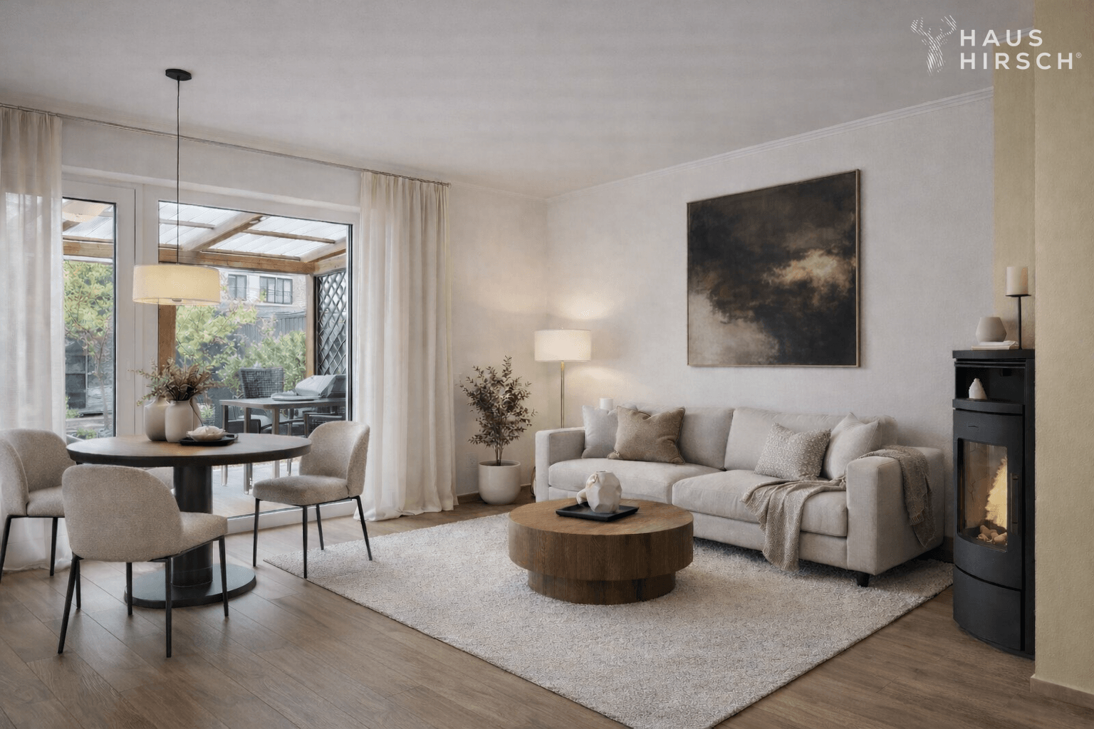 • großzügiger Wohn-Essbereich im EG mit eingebautem Kamin