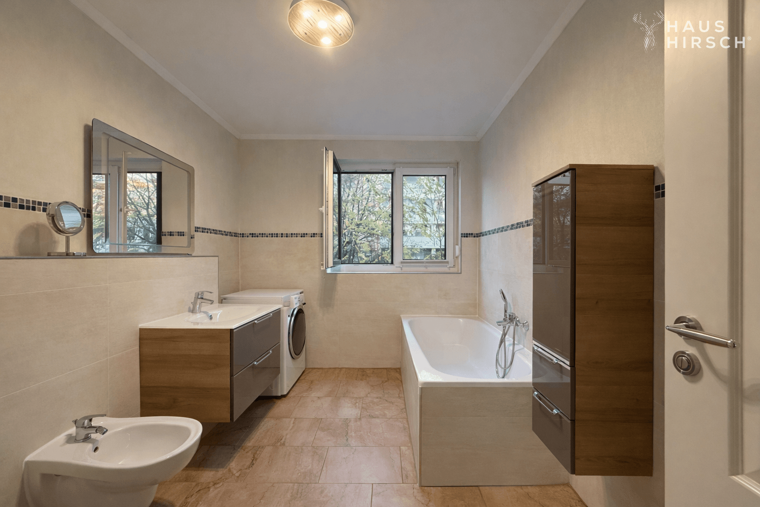• modernes Wannenbad mit WC, Bidet, Waschtisch und Fenster